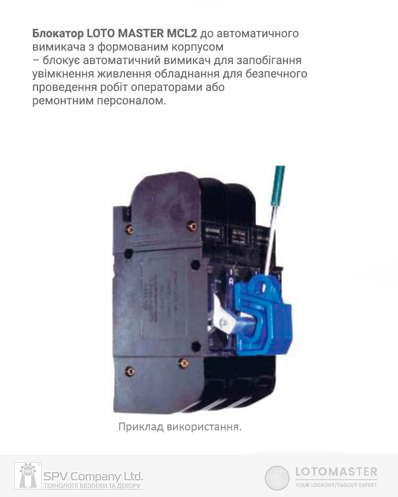 Блокатор LOTO MASTER MCL2 до автоматичного вимикача з формованим корпусом – блокує автоматичний вимикач для запобігання увімкнення живлення обладнання для безпечного проведення робіт операторами або ремонтним персоналом.