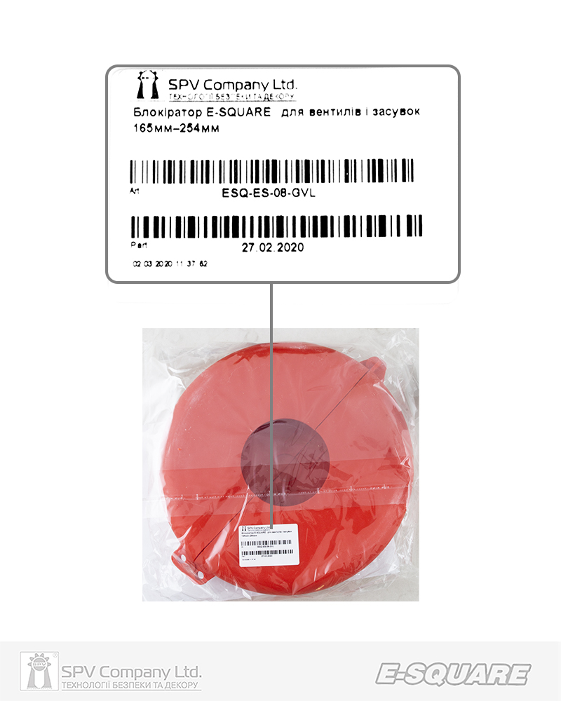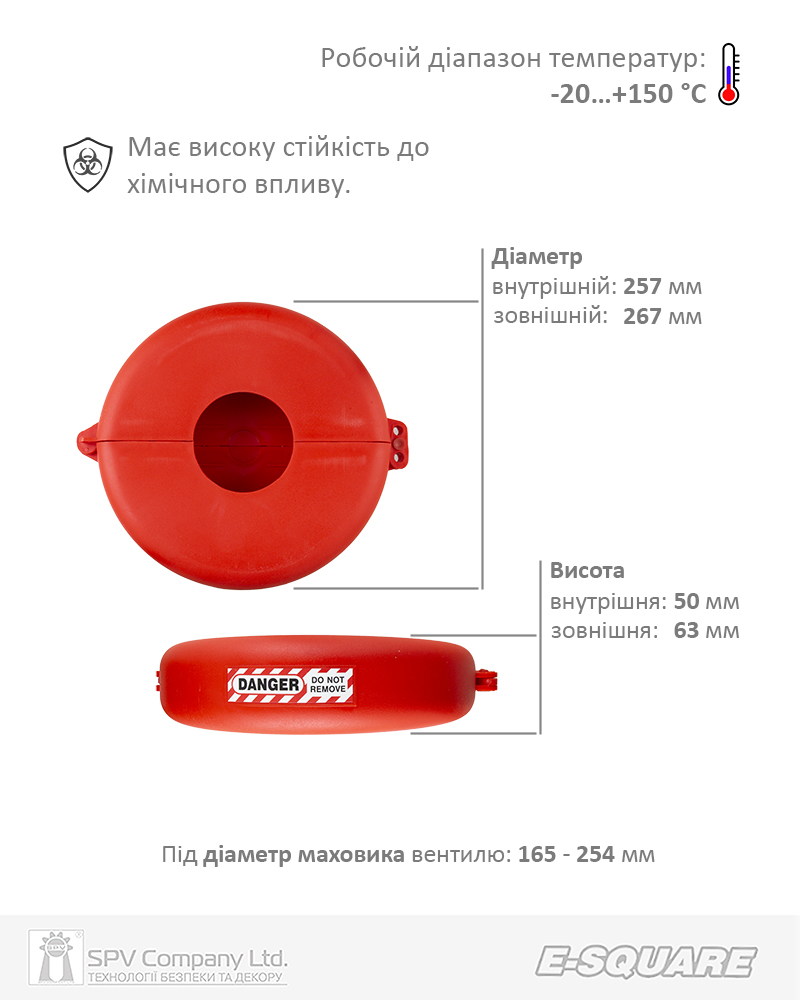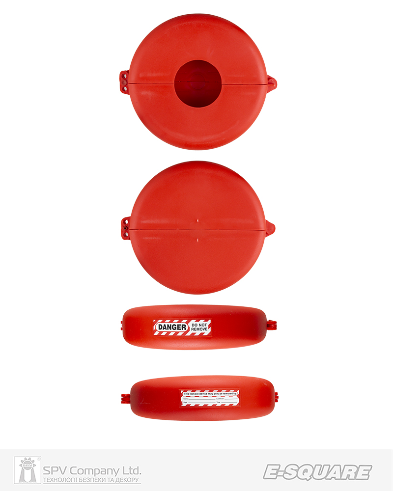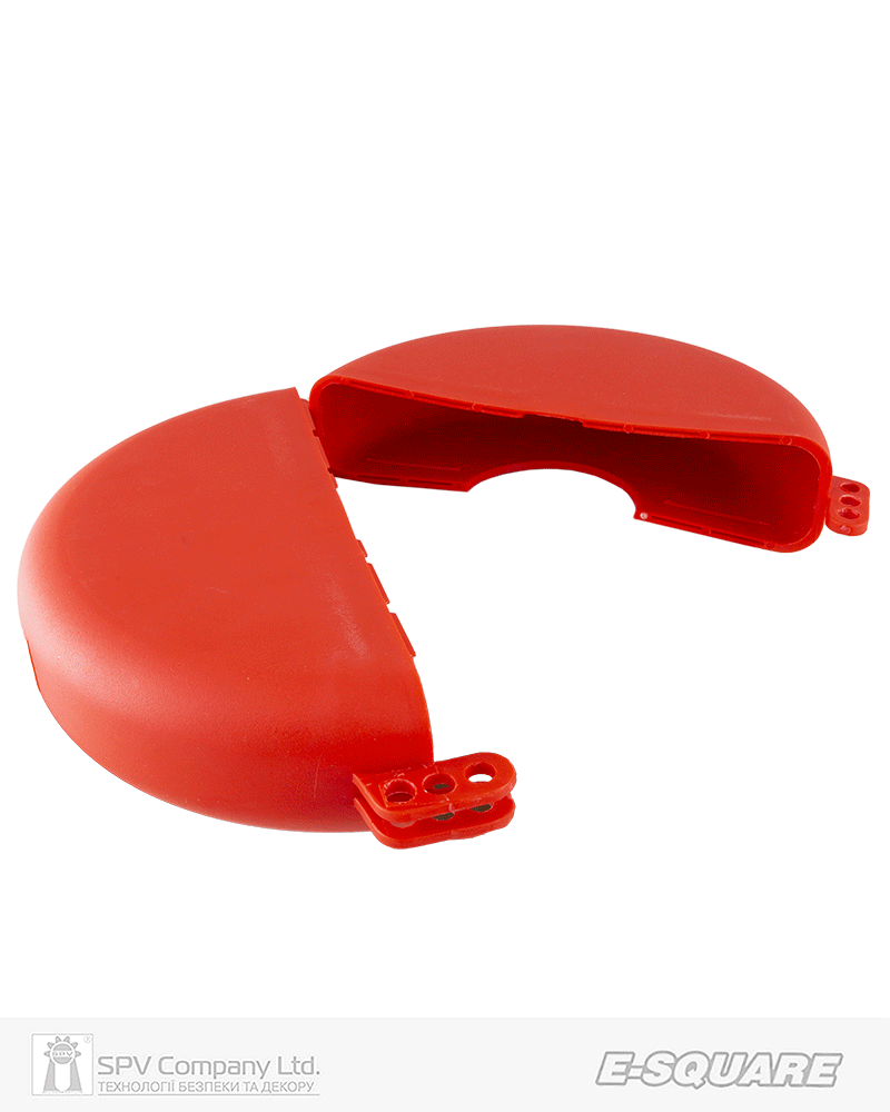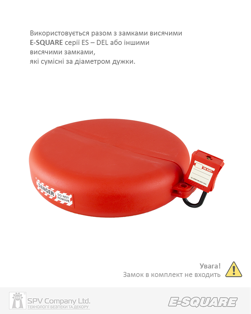 Використається для блокування вентилів та засувок різних діаметрів, в тому числі й з висувним штоком. При встановленні на вентиль вільно обертається та унеможливлює його використання. Має високу стійкість до хімічного впливу. Використається разом з замками висячими E-SQUARE серії ES – DEL або іншими висячими замками, які сумісні за діаметром дужки.