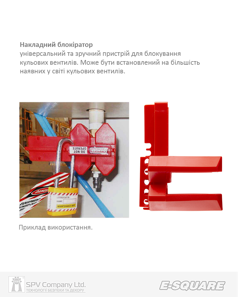 Накладний блокіратор – універсальний та зручний пристрій для блокування кульових вентилів. Може бути встановлений на більшість наявних у світі кульових вентилів. Виготовлений з діелектричного матеріалу, стійкий до механічних пошкоджень. Використається разом з замками висячими E-SQUARE серії ES – DEL або іншими висячими замками, які сумісні за діаметром дужки. Можливе блокування вентилю у зачиненому або відчиненому положенні.
