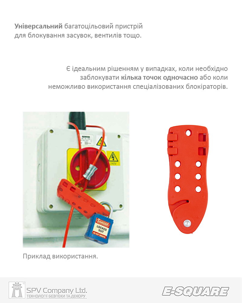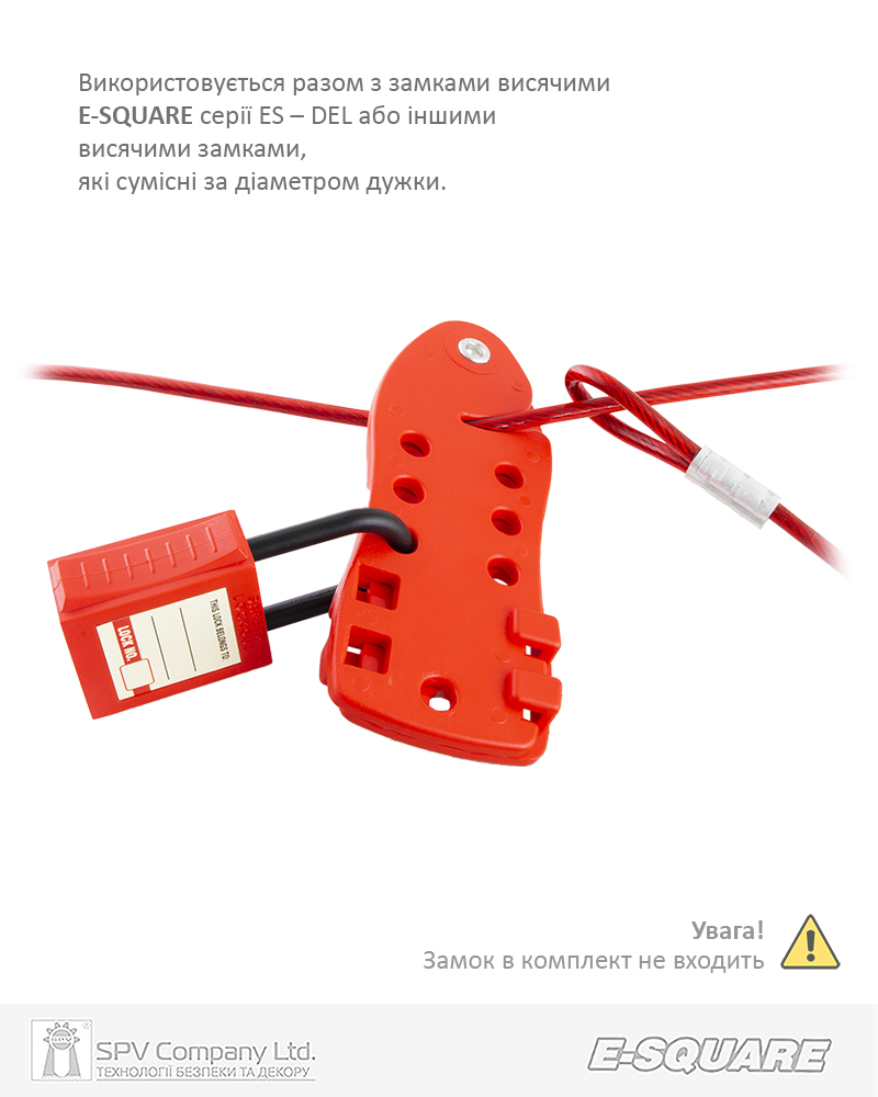 Універсальний багатоцільовий пристрій для бокування засувок, вентилів тощо. Є ідеальним рішенням у випадках, коли необхідно заблокувати кілька точок одночасно або коли неможливо використання спеціалізованих блокіраторів. Комплектується тросом з петлею з одного боку. Використається разом з замками висячими E-SQUARE серії ES – DEL або іншими висячими замками, які сумісні за діаметром дужки.