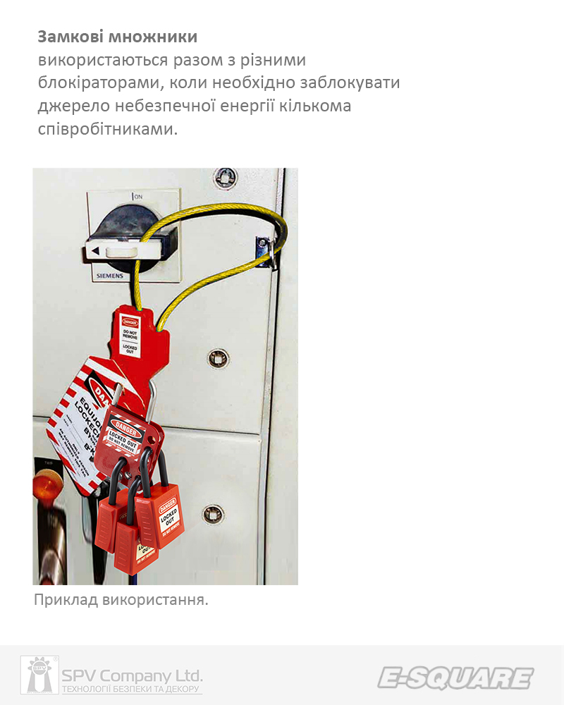 Замкові множники використаються разом з різними блокіраторами, коли необхідно заблокувати джерело небезпечної енергії кількома співробітниками. Для блокування використаються кілька висячих замків E-SQUARE серії ES – DEL або іншими висячими замками, які сумісні за діаметром дужки.