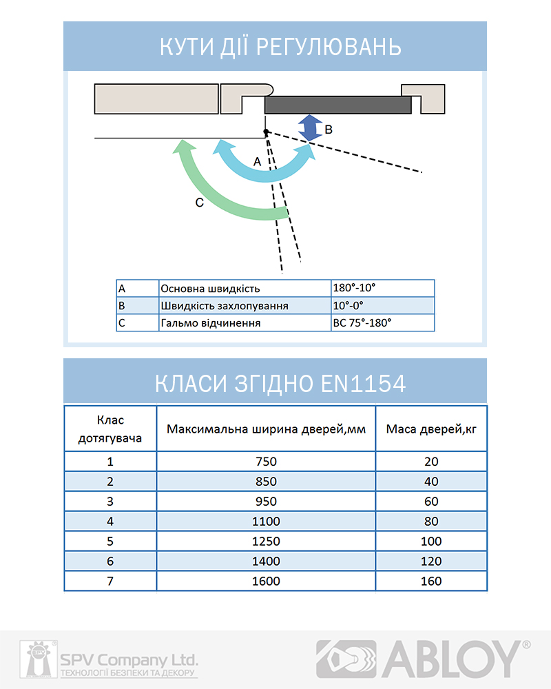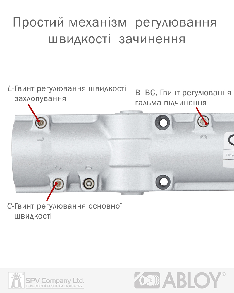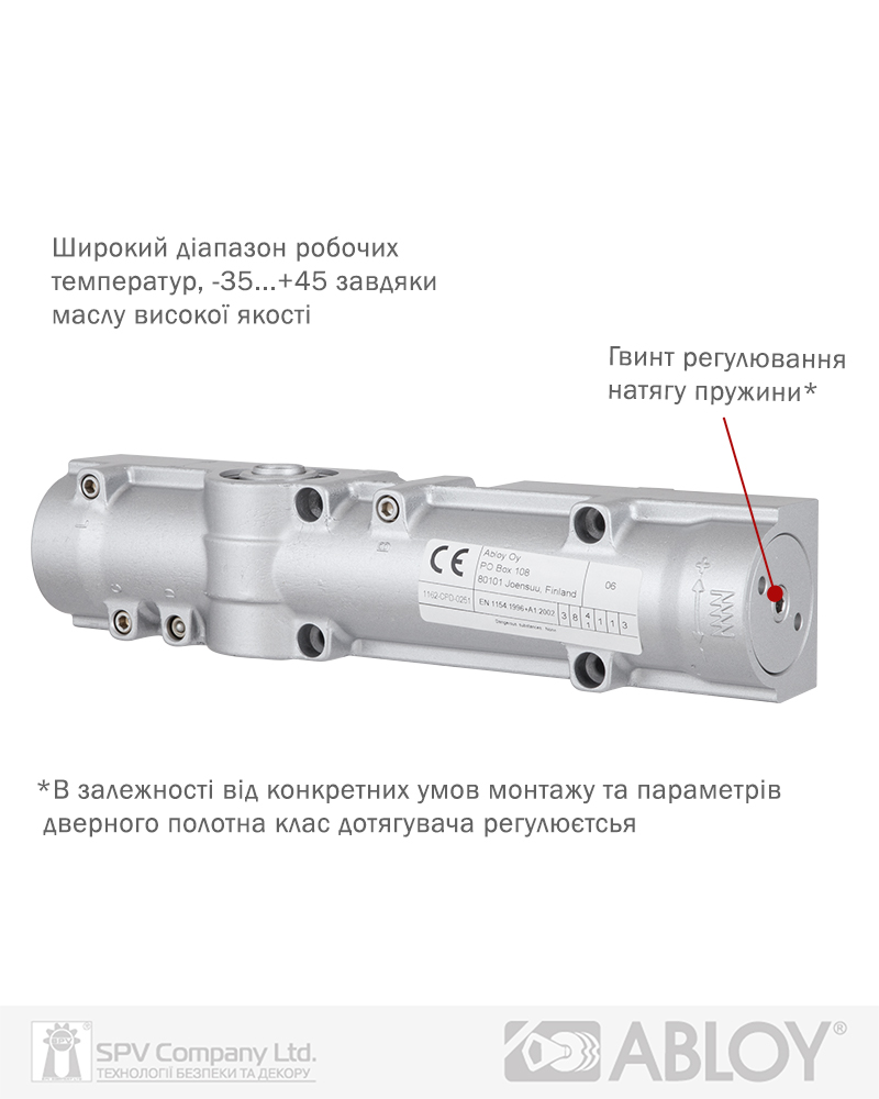 Має регулювання натягу внутрішньої пружини (класу дотягувача), що дозволяє використовувати єдину модель дотягувача до різних класів дверей. Також полегшує регулювання сили закривання дотягувача, не змінюючи його положення на дверях.