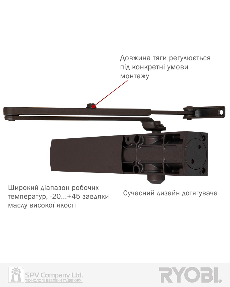 Дотягувач дверей RYOBI® серії 1200 модель D-1200 STD (Японія) накладного типу зі стандартною тягою – призначений для керування зовнішніми та внутрішніми дверима.