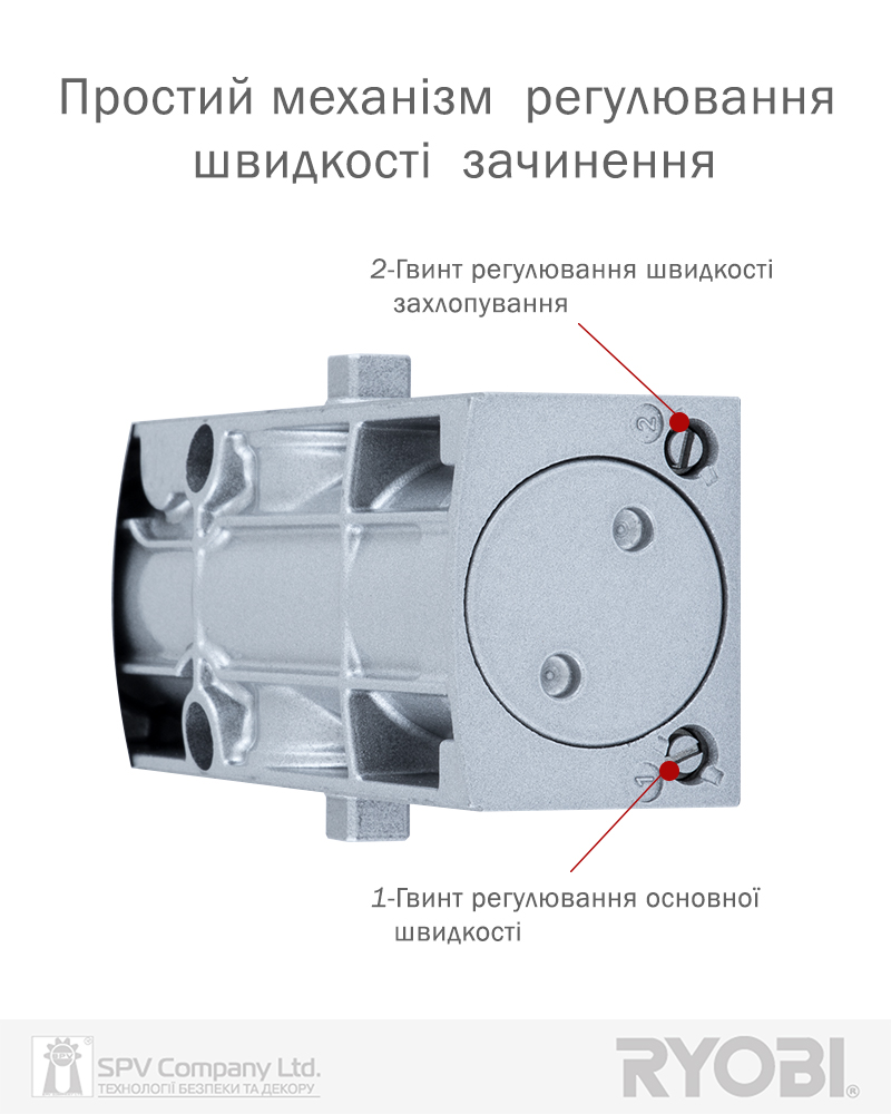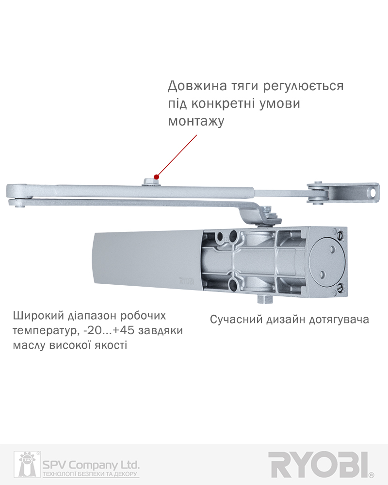 Дотягувач дверей RYOBI® серії 1200 модель D-1200 STD (Японія) накладного типу зі стандартною тягою – призначений для керування зовнішніми та внутрішніми дверима.