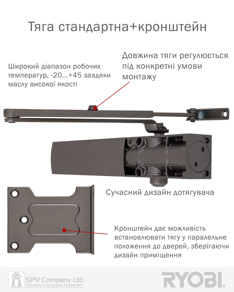 Комплектація: дотягувач, комплект кріплення, тяга стандартна, кронштейн паралельної тяги.