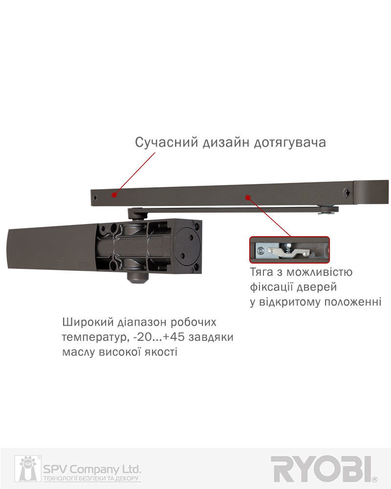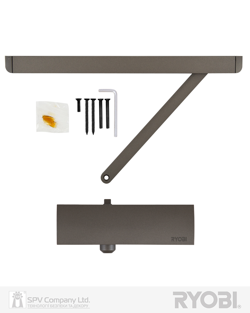 Дотягувач дверей RYOBI® серії 1200 модель D-1200T (Японія) накладного типу з ковзною тягою – призначений для керування внутрішніми та легкими зовнішніми дверима.