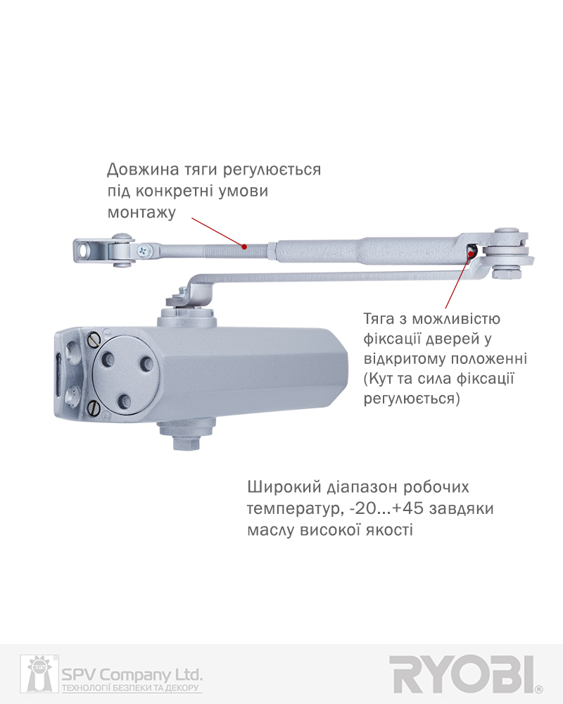 Дотягувач дверей RYOBI® серії 1500 модель DS-1504 STD_HO(Японія) накладного типу – призначений для керування зовнішніми та внутрішніми дверима.