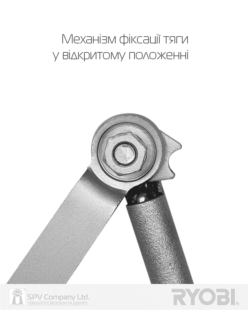 У комплекті тяга із фіксацією відчіненого положення дверей. При відкритті дверей до встановленого кута дотягувач працює як завжди, автоматично зачиняючи двері. При відкритті ширше, двері фіксуються у відкритому положенні.