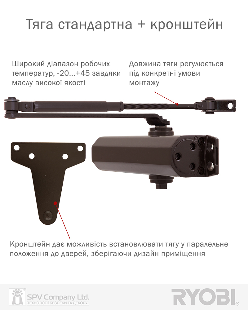 Комплектація: дотягувач, комплект кріплення, тяга стандартна, кронштейн паралельної тяги