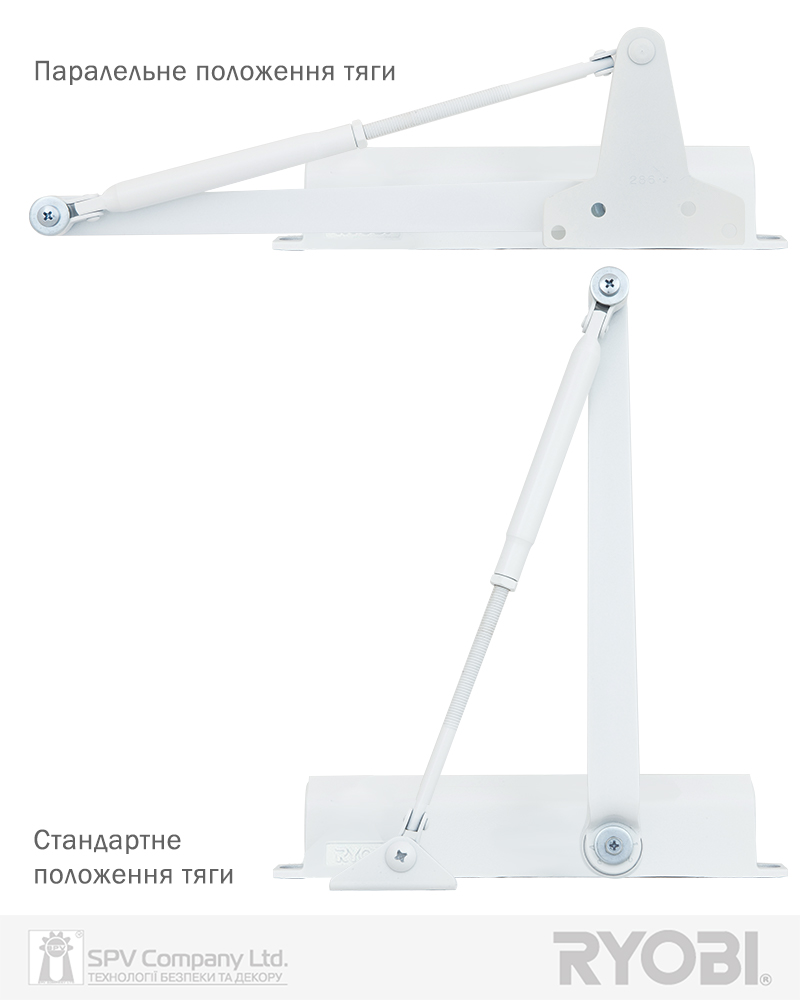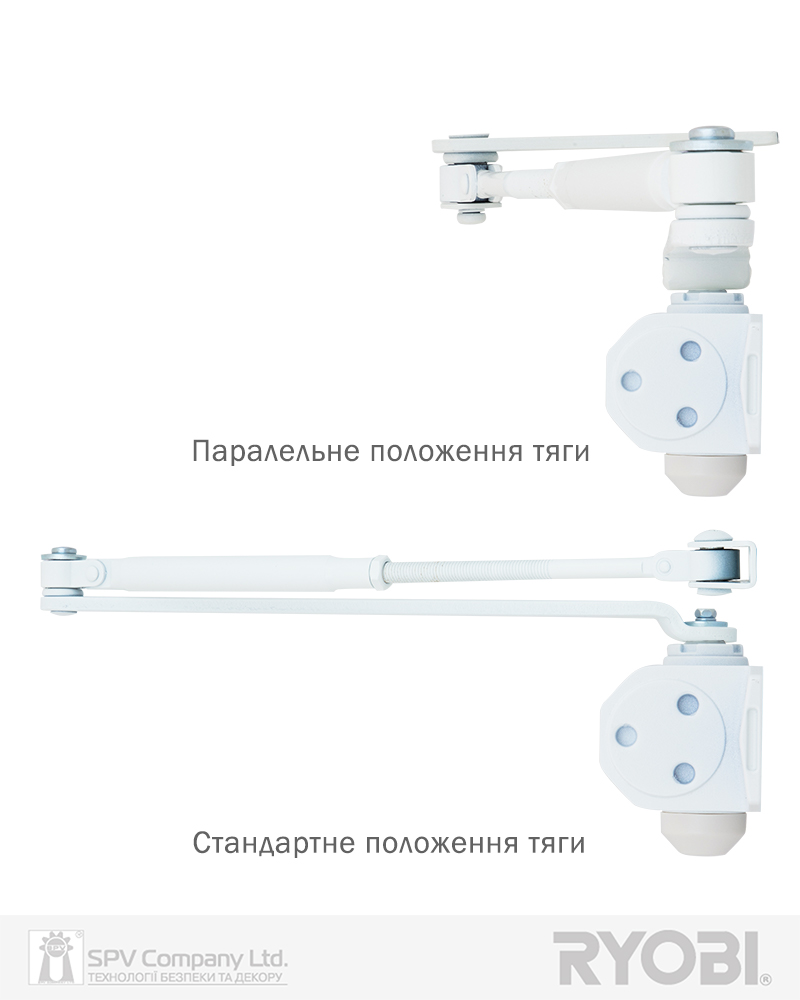 Стандартна тяга, т.з. «коліно», надає два варіанта встановлення дотягувача на дверях.