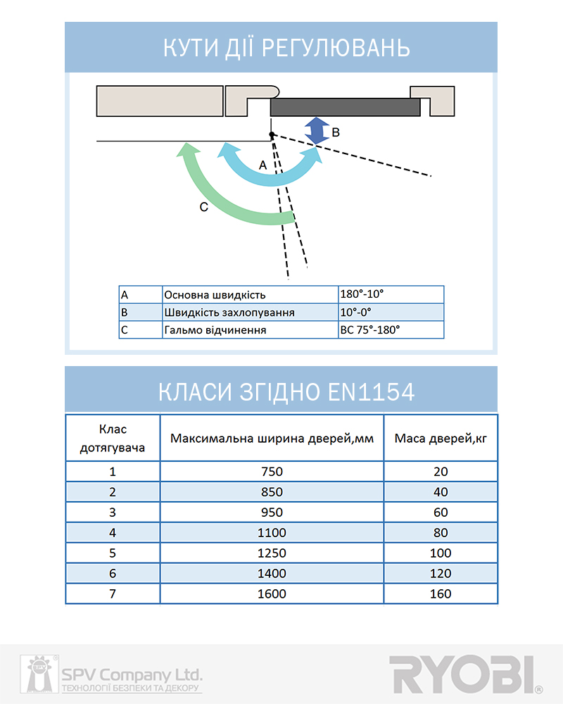 Регулювання класу дотягувача відбувається шляхом переміщення дотягувача по дверному полотну, див. монтажний шаблон який входить в комплектацію з дотягувачем.
