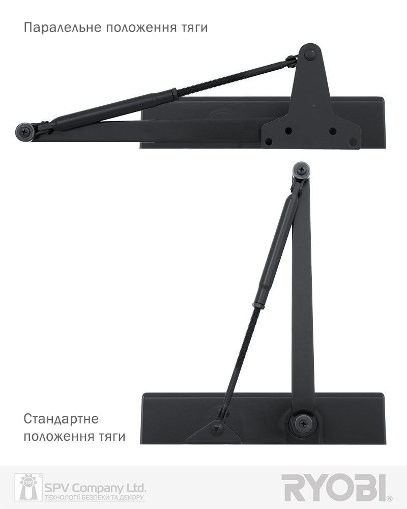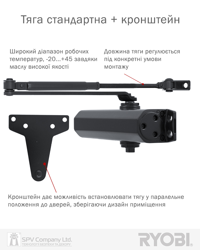 Комплектація: дотягувач, декоративна кришка, комплект кріплення, тяга стандартна, кронштейн паралельної тяги