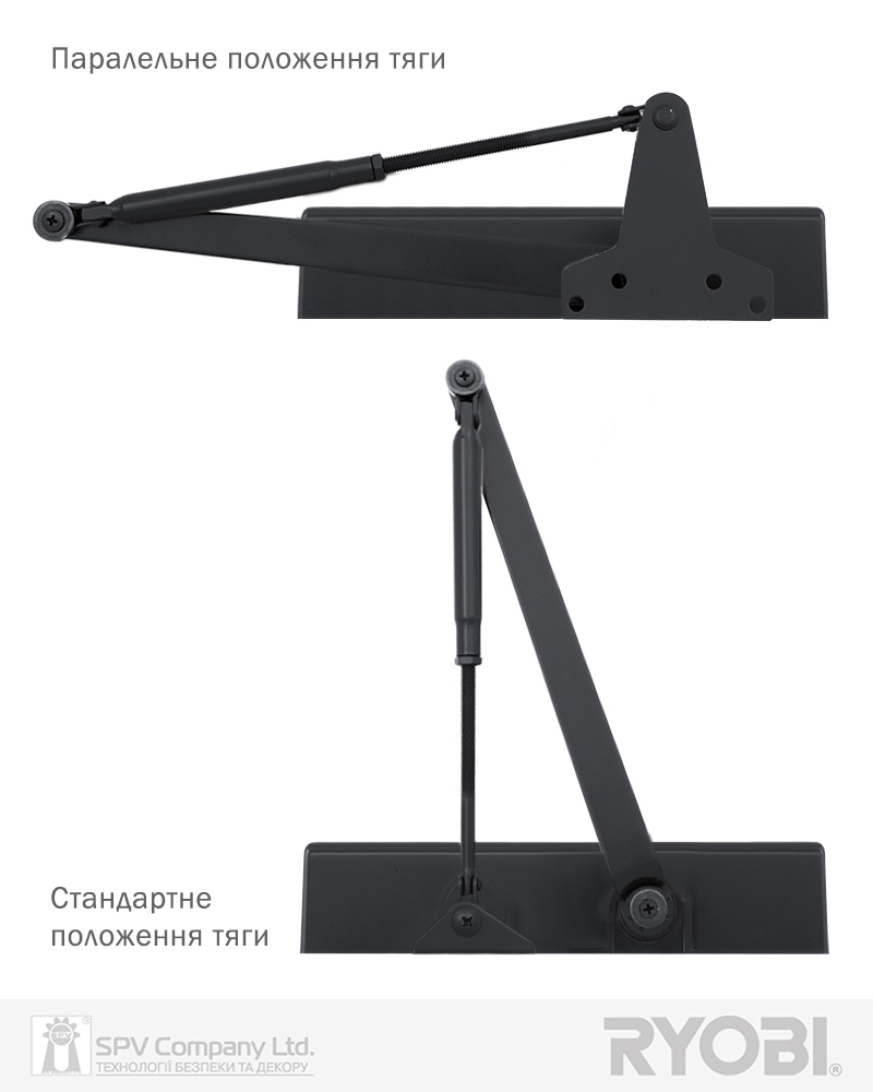 Стандартна тяга, т.з. «коліно», надає два варіанта встановлення дотягувача на дверях.