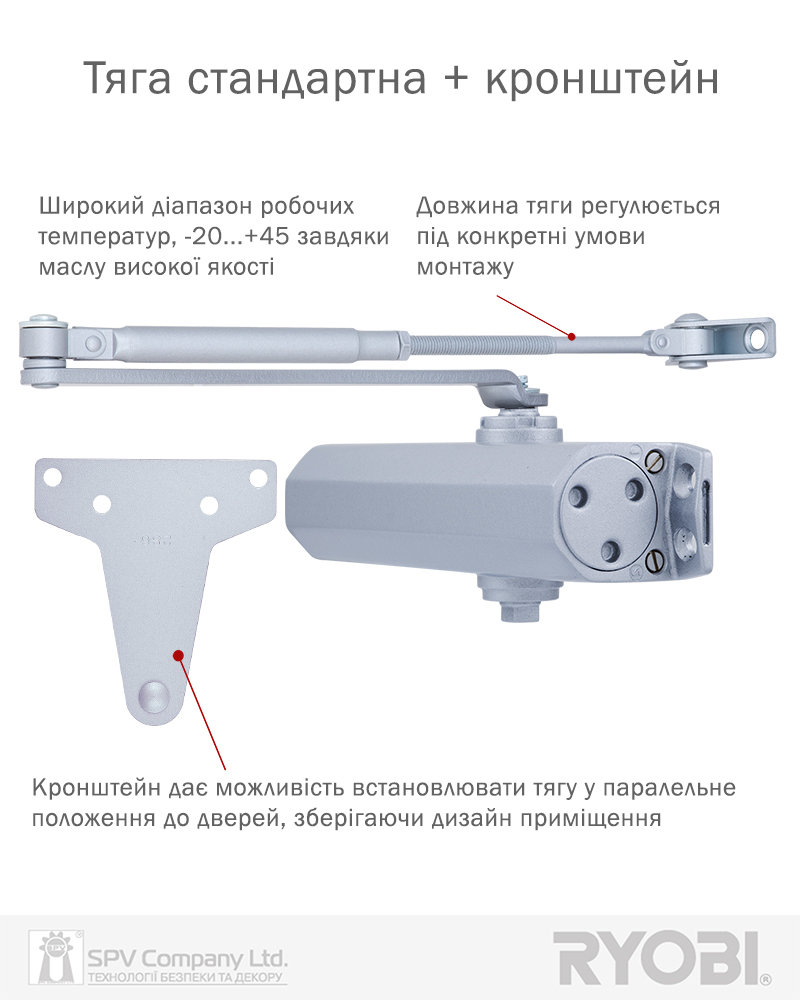 Комплектація: дотягувач, декоративна кришка, комплект кріплення, тяга стандартна, кронштейн паралельної тяги