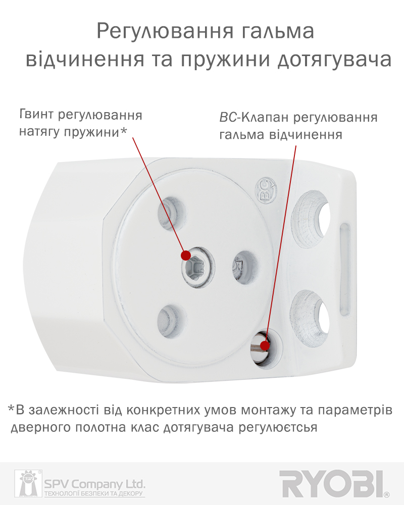 Має регулювання натягу внутрішньої пружини (класу дотягувача), що дозволяє використовувати єдину модель дотягувача до різних класів дверей. Також полегшує регулювання сили закривання дотягувача, не змінюючи його положення на дверях.