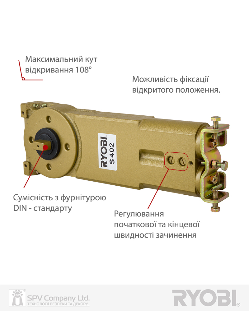 Дотягувач підлоговий RYOBI, серії 400, модель S-402 HO (Японія), призначений для дверей маятникового типу, у тому числі і цільноскляних.
