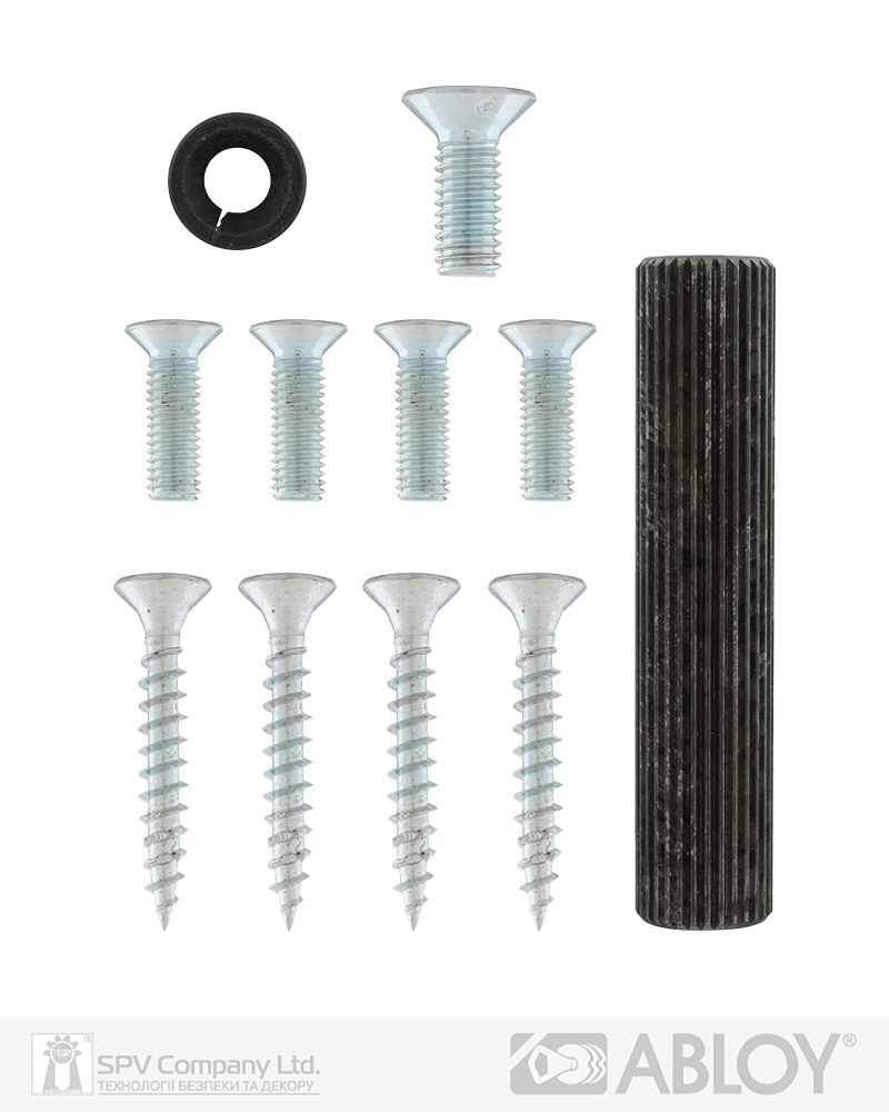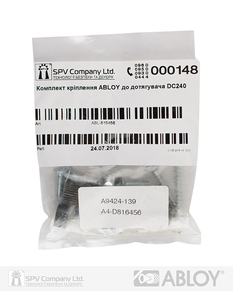 Комплект кріплення Abloy до дотягувача DC240. Призначений для кріплення тяги до корпусу дотягувача і, безпосередньо, дотягувача до дверного полотна чи коробу. Для кріплення на дерев’яну основу застосовуються саморізи, на металеву – гвинти.
