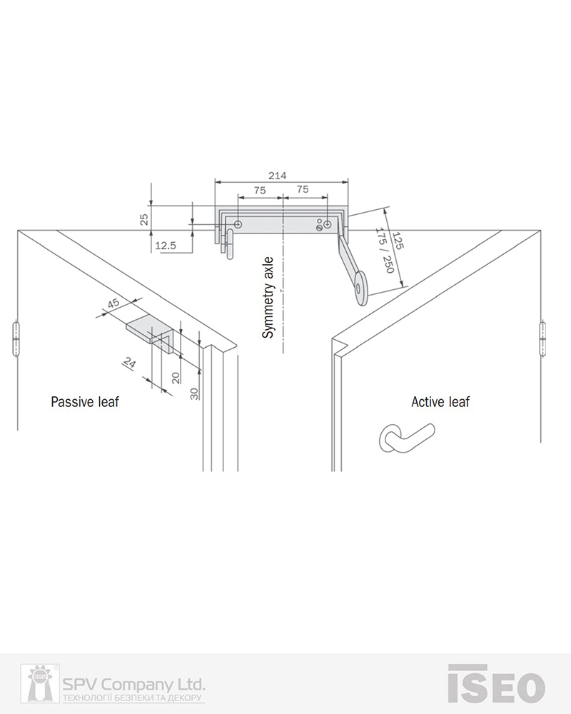 Гравітаційний координатор дверей ISEO SP81 встановлюється на дверній рамі з боку відкривання дверей. Довгий важіль блокує останні кілька градусів закривання активної стулки, до тих пір, поки не закриється пасивна стулка, див. схему і відео.