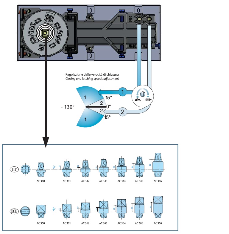 *1500 - дотягувачі накладного типу для внутрішніх та зовнішніх дверей *8800 - дотягувачі накладного типу для внутрішніх та легких зовнішніх дверей *9900 - дотягувачі накладного типу для внутрішніх та легких зовнішніх дверей 1000 - дотягувачі накладного типу для надважких великогабаритних внутрішніх та зовнішніх дверей, що підлягають сильному тиску та навантаженню 1200 - дотягувачі накладного типу для внутрішніх та зовнішніх дверей 200 - дотягувачі підлогові маятникового типу для внутрішніх та зовнішніх дверей 2000 - дотягувачі накладного типу для внутрішніх та зовнішніх дверей 2550 - дотягувачі накладного типу для внутрішніх та зовнішніх дверей 3550 - дотягувачі накладного типу для промислових внутрішніх та зовнішніх дверей 400 - дотягувачі підлогові зі зменшеною товщиною корпусу для внутрішніх та зовнішніх дверей 4550 - дотягувачі накладного типу для промислових внутрішніх та зовнішніх дверей, що підлягають сильному тиску та навантаженню 500 - дотягувачі підлогові зі зменшеною товщиною корпусу для внутрішніх та зовнішніх дверей CO-50 - дотягувачі врізного типу для внутрішніх та зовнішніх дверей COU-50 - - дотягувачі врізного типу зі зменшеною товщиною корпусу для внутрішніх та зовнішніх дверей FR - дотягувачі безважільного типу, прихованого монтажу, для дверей та воріт, що відчиняються навстіж, у тому числі для протипожежних дверей і дверей евакуаційних виходів. CAM - з кулачковим механізмом, тобто технологія у якій в якості передаточної ланки між пружинним елементом та шпинделем використовується спеціально профільований кулачок серцевидної форми. R&P - з шестернею та зубчатою рейкою, тобто технологія з гідравлічним контуром та механічною рейковою передачею моменту. Дана технологія забезпечує плавний рух в досить широкому класовому діапазоні та дозволяє більш сильне притискання дверного полотна в момент стиснення дверного ущільнювача, а також швидке захлопування язичка замка чи роликової заскочки замка. GEO PRO - дотягувач комбінованого типу CAM та R&P з ковзною тягою для важких дверей. Функція 2в1.