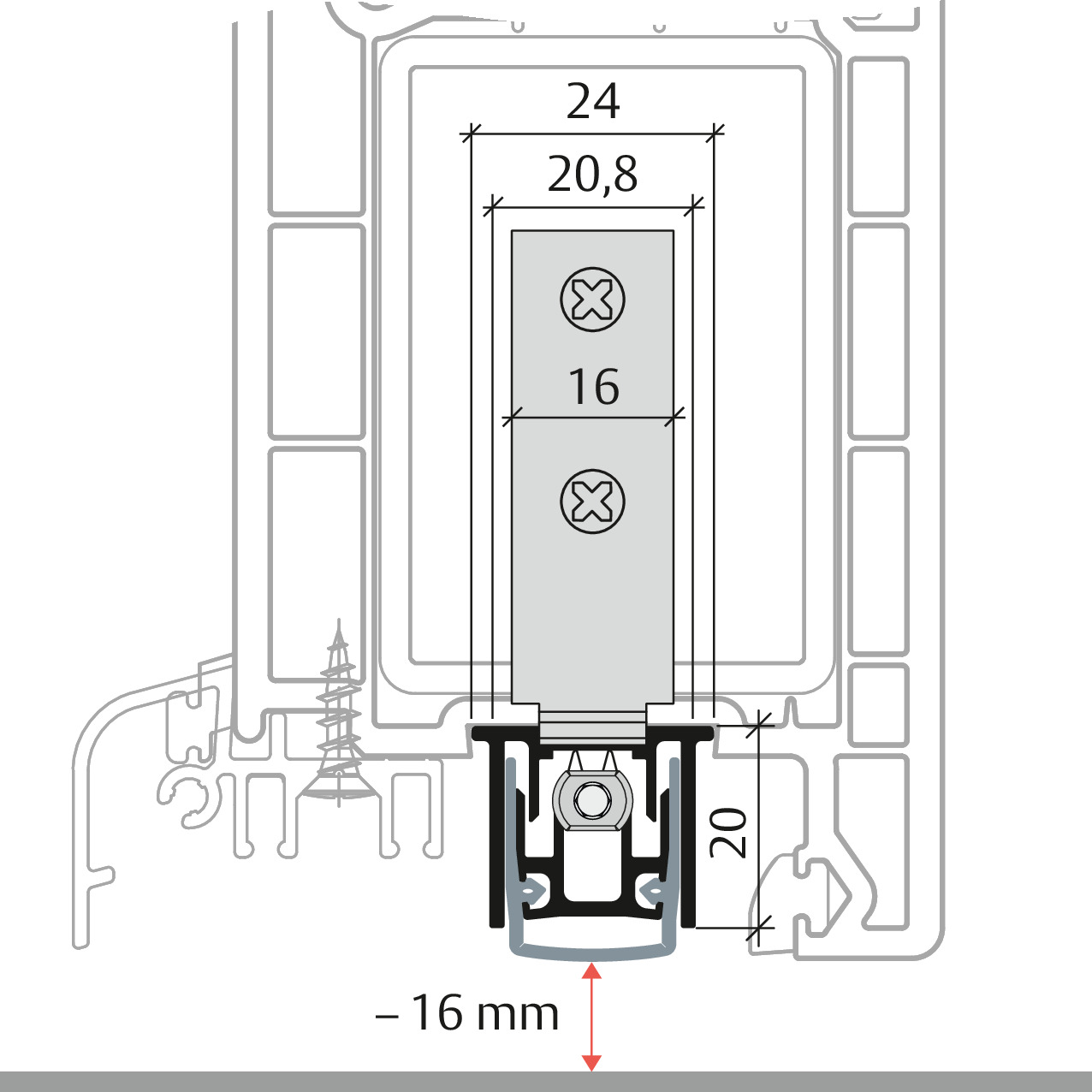 Пороги серії RS розроблені спеціально для використання в профільних ПВХ дверях. Кріплення 16 мм. розраховане під фурнітурний паз в ПВХ профіль . Глибина опускання - до 16 мм.