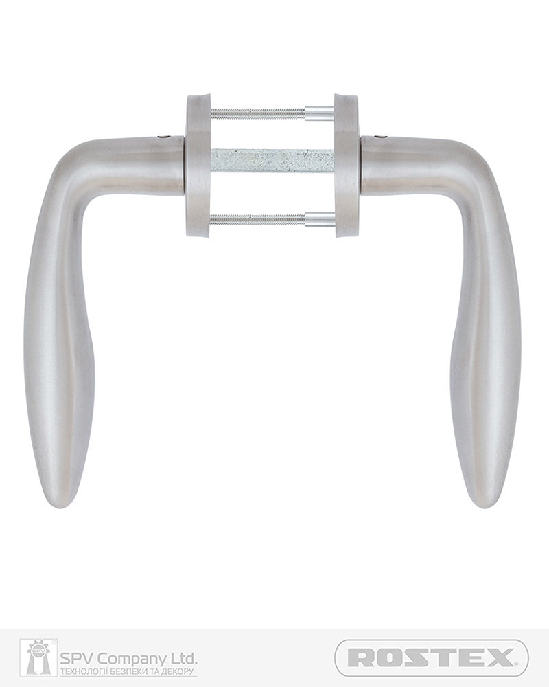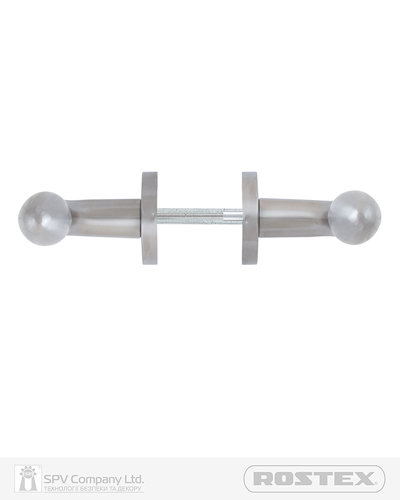 Підходить для дверей завтовшки 38-52 мм. Має якісну поворотну пружину, що розрахована на велике експлуатаційне навантаження та посилену конструкцію з фіксуючими металевими елементами. Європейський стандарт дверних ручок - EN 1906. В комплекті: шток – 8х8 мм, болти М4 для наскрізного кріплення з заглушками. Болти можна вкорочувати в залежності від товщини дверей. Відстань між болтами 38 мм. Такий набір дозволяє кріпити ручку наскрізними гвинтами , якщо у замку є отвори. Кріплення з нержавіючої сталі.