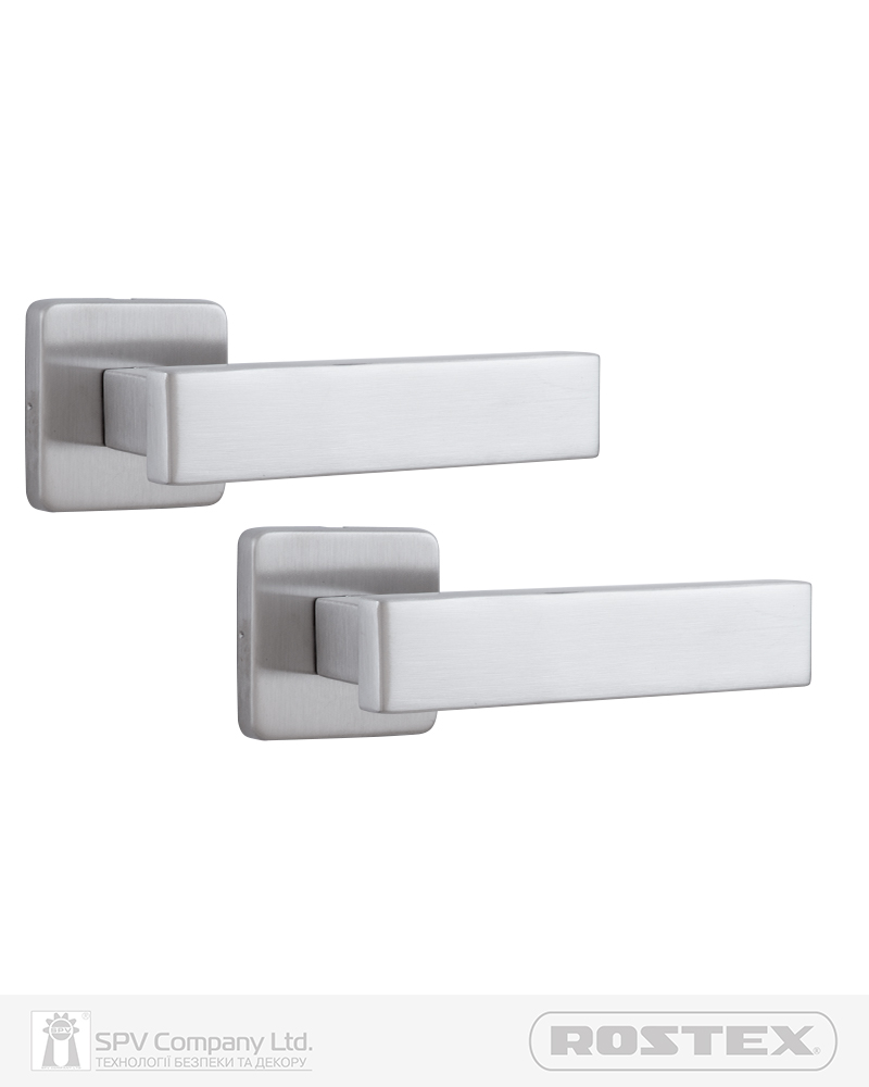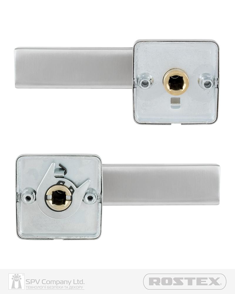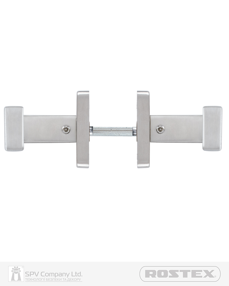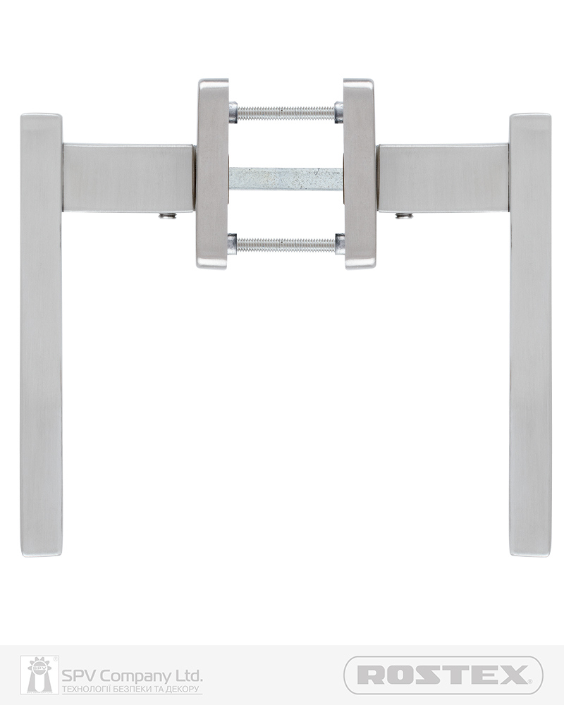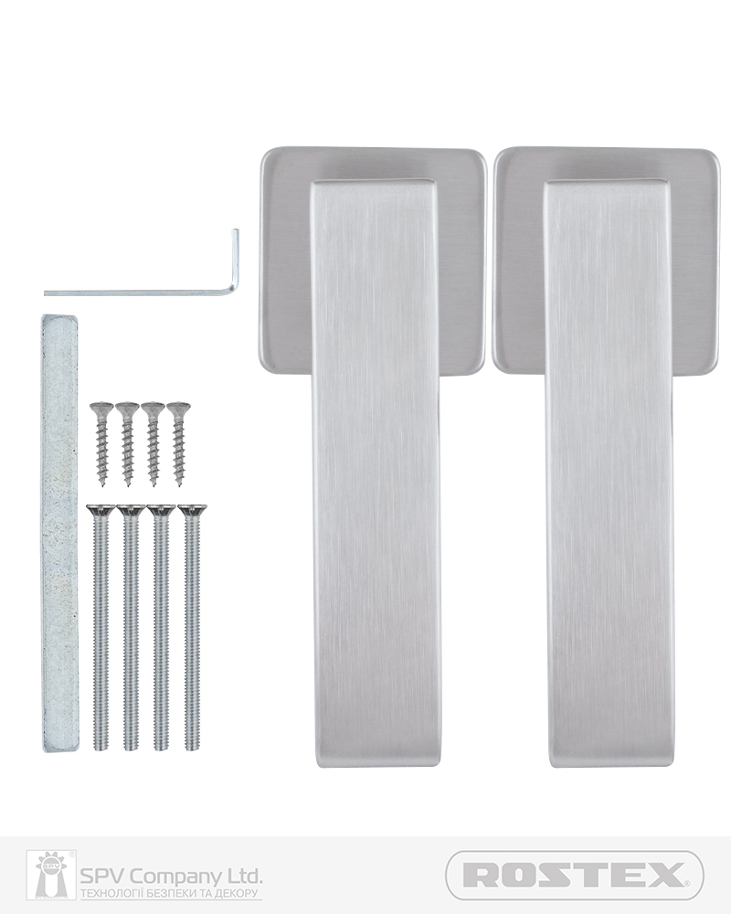 Підходить для дверей завтовшки 38-52 мм. Має якісну поворотну пружину, що розрахована на велике експлуатаційне навантаження та посилену конструкцію з фіксуючими металевими елементами. Європейський стандарт дверних ручок - EN 1906. В комплекті: шток – 8х8 мм, болти М4 для наскрізного кріплення з заглушками. Болти можна вкорочувати в залежності від товщини дверей. Відстань між болтами 38 мм. Такий набір дозволяє кріпити ручку наскрізними гвинтами , якщо у замку є отвори. Кріплення з нержавіючої сталі.