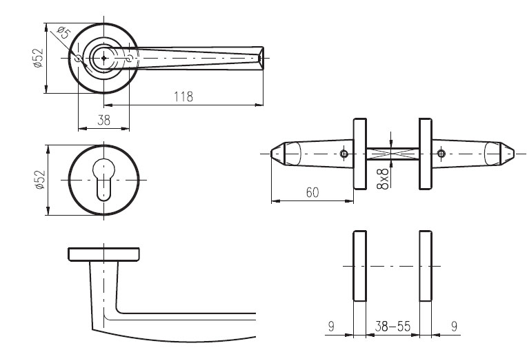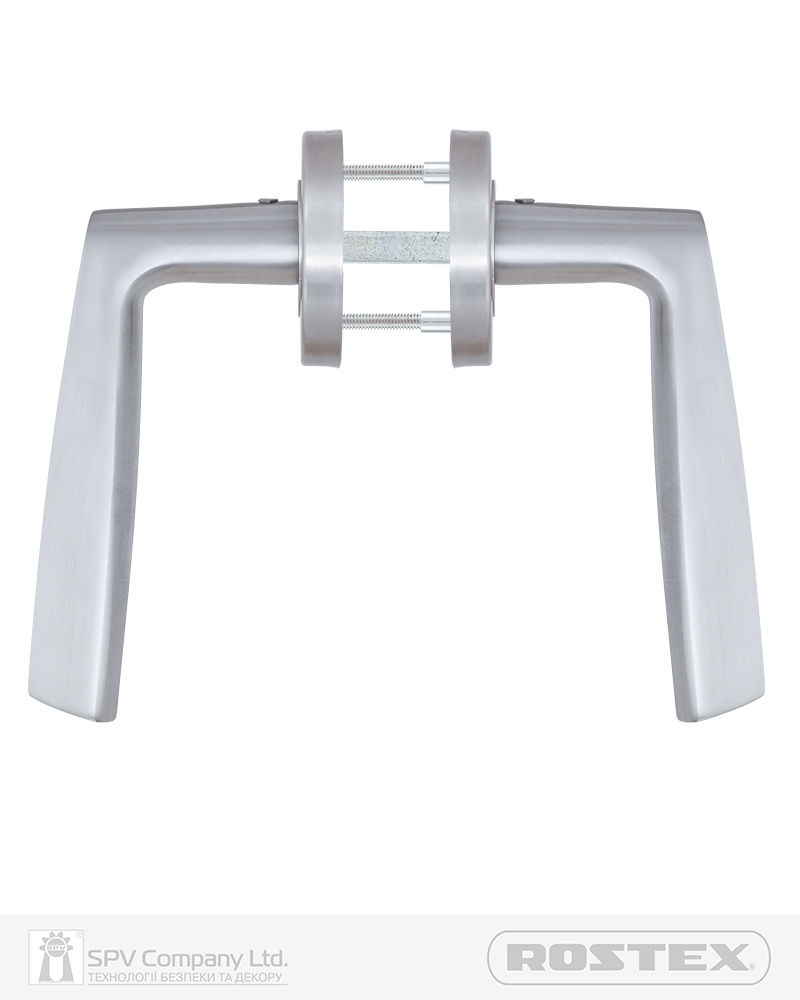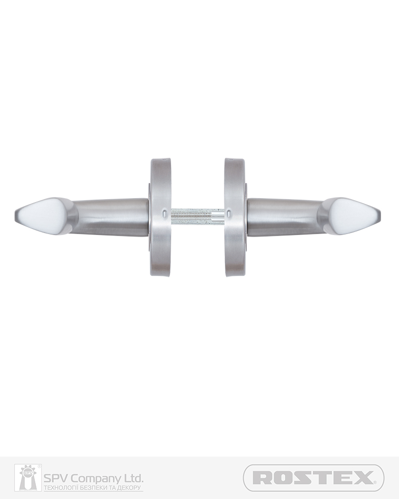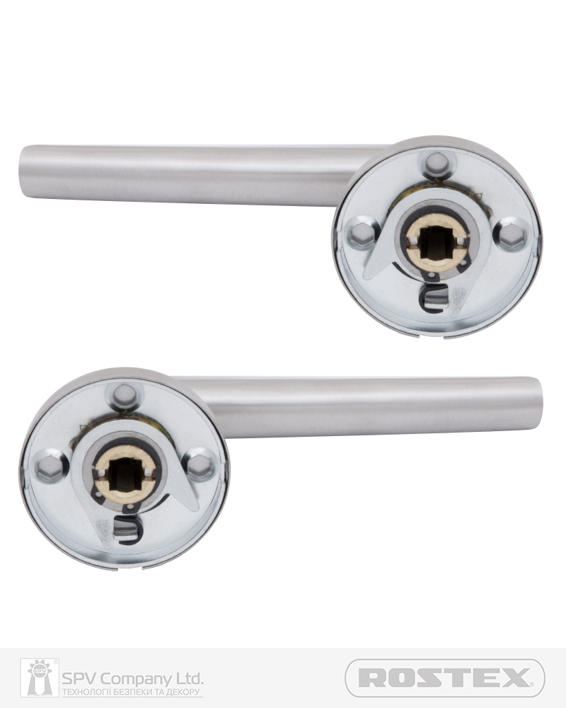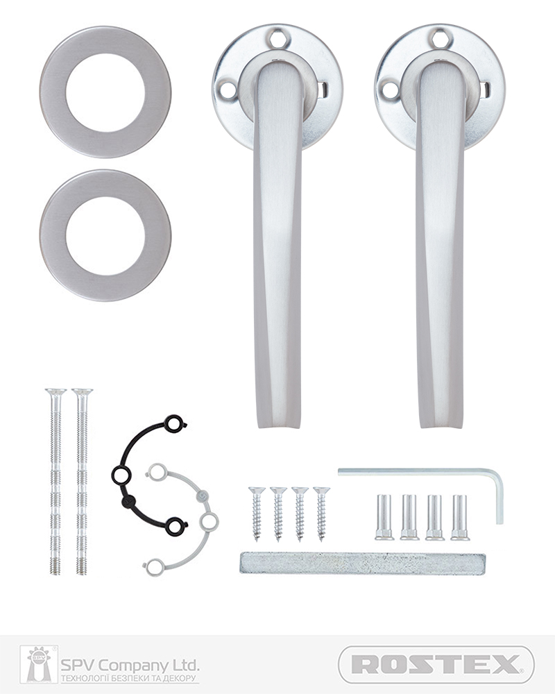 Підходить для дверей завтовшки 38-52 мм. Має якісну поворотну пружину, що розрахована на велике експлуатаційне навантаження. Європейський стандарт дверних ручок - EN 1906. В комплекті: шток – 8х8 мм, саморізи для кріплення безпосередньо до полотна дверей та болти М4 для наскрізного кріплення з заглушками. Болти можна вкорочувати в залежності від товщини дверей. Відстань між болтами 38 мм. Такий набір дозволяє кріпити ручку, як до полотна дверей, так і наскрізними гвинтами (якщо у замку є отвори), в залежності від вашого вибору. Кріплення з нержавіючої сталі. Пластикові вставки використовують, якщо ручка монтується наскрізними гвинтами. Вони виконують роль прихованого спейсера і запобігають тертю щитка ручки по полотну дверей. В комплекті дві пластикові вставки: номер «5» для зовнішньої сторони та номер «4» для внутрішньої.