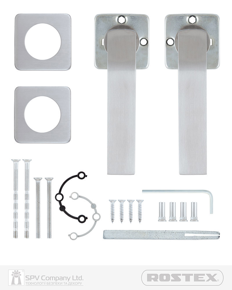 Підходить для дверей завтовшки 38-52 мм. Має якісну поворотну пружину, що розрахована на велике експлуатаційне навантаження. Європейський стандарт дверних ручок - EN 1906. В комплекті: шток – 8х8 мм, саморізи для кріплення безпосередньо до полотна дверей та болти М4 для наскрізного кріплення з заглушками. Болти можна вкорочувати в залежності від товщини дверей. Відстань між болтами 38 мм. Такий набір дозволяє кріпити ручку, як до полотна дверей, так і наскрізними гвинтами (якщо у замку є отвори), в залежності від вашого вибору. Кріплення з нержавіючої сталі. Пластикові вставки використовують, якщо ручка монтується наскрізними гвинтами. Вони виконують роль прихованого спейсера і запобігають тертю щитка ручки по полотну дверей. В комплекті дві пластикові вставки: номер «5» для зовнішньої сторони та номер «4» для внутрішньої.