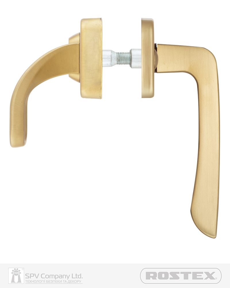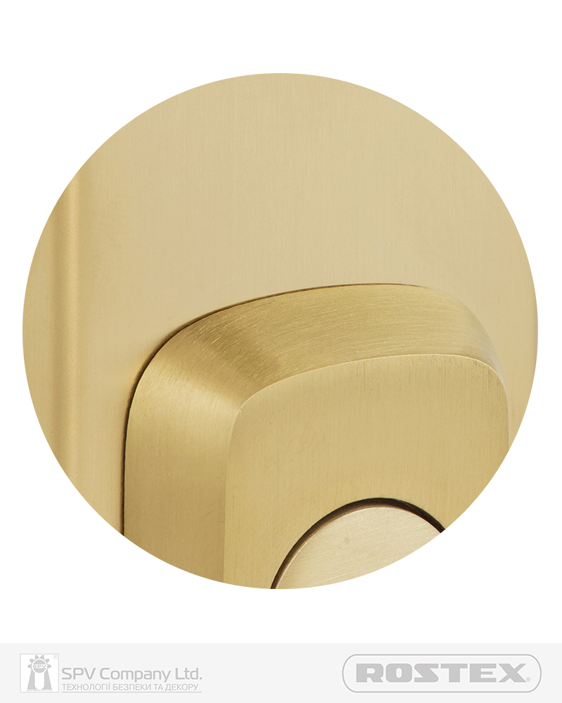 Обробка нержавіюча сталь матова титан PVD, має спокійний жовтий колір матову поверхню, яка оброблена щіткою. Найкраще виглядає на темних дверях, підходить до інтер’єрів у класичному та сучасному стилях.