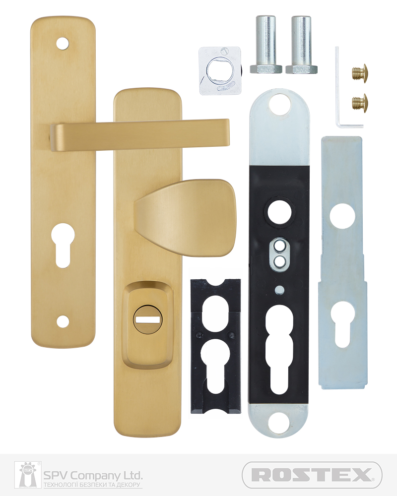 Фурнітура захисна ROSTEX R1 ASTRA до основних замків для вхідних металевих та деревяних дверей товщиною 38-55мм з можливістю подовження до 100мм (комплекти подовження замовляються окремо). З-й клас безпеки. Матеріал: нержавіюча сталь. Загартований протектор циліндра із захистом від висвердлювання. Кріплення - гвинти М8.