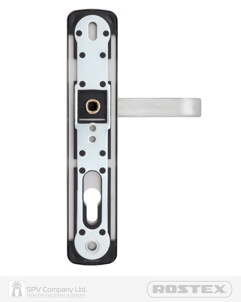 Плата, що захищає корпус замка. Загартований протектор циліндра із захистом від висвердлювання. Кріплення - гвинти М8.