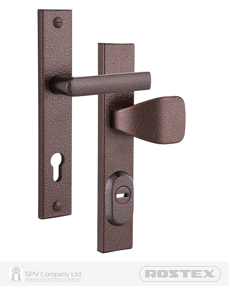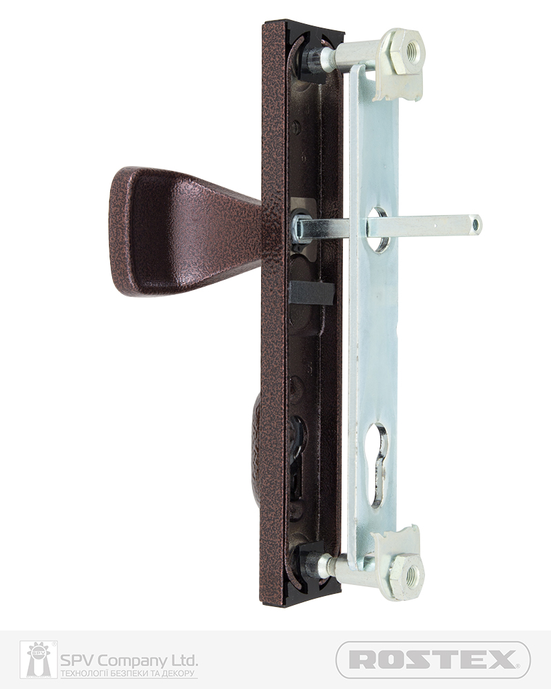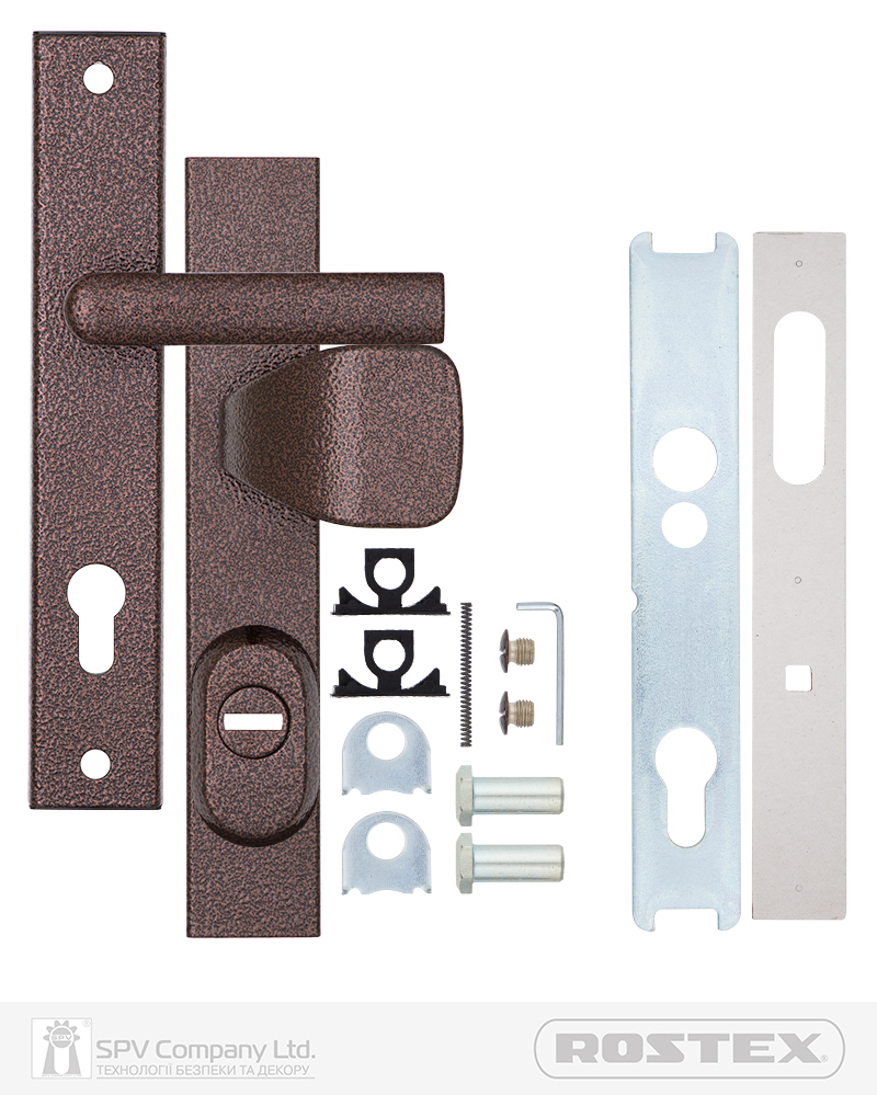 Фурнітура захисна ROSTEX R1 до основних замків для вхідних металевих, деревяних та профільних дверей товщиною 38-55мм з можливістю подовження до 100мм (комплекти подовження замовляються окремо). З-й клас безпеки. Матеріал: нержавіюча сталь, замак. Плата, що захищає корпус замка. Загартований протектор циліндра із захистом від висвердлювання. Кріплення - болти М8.