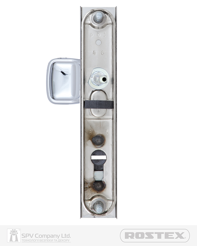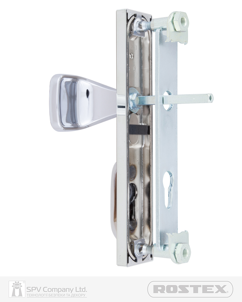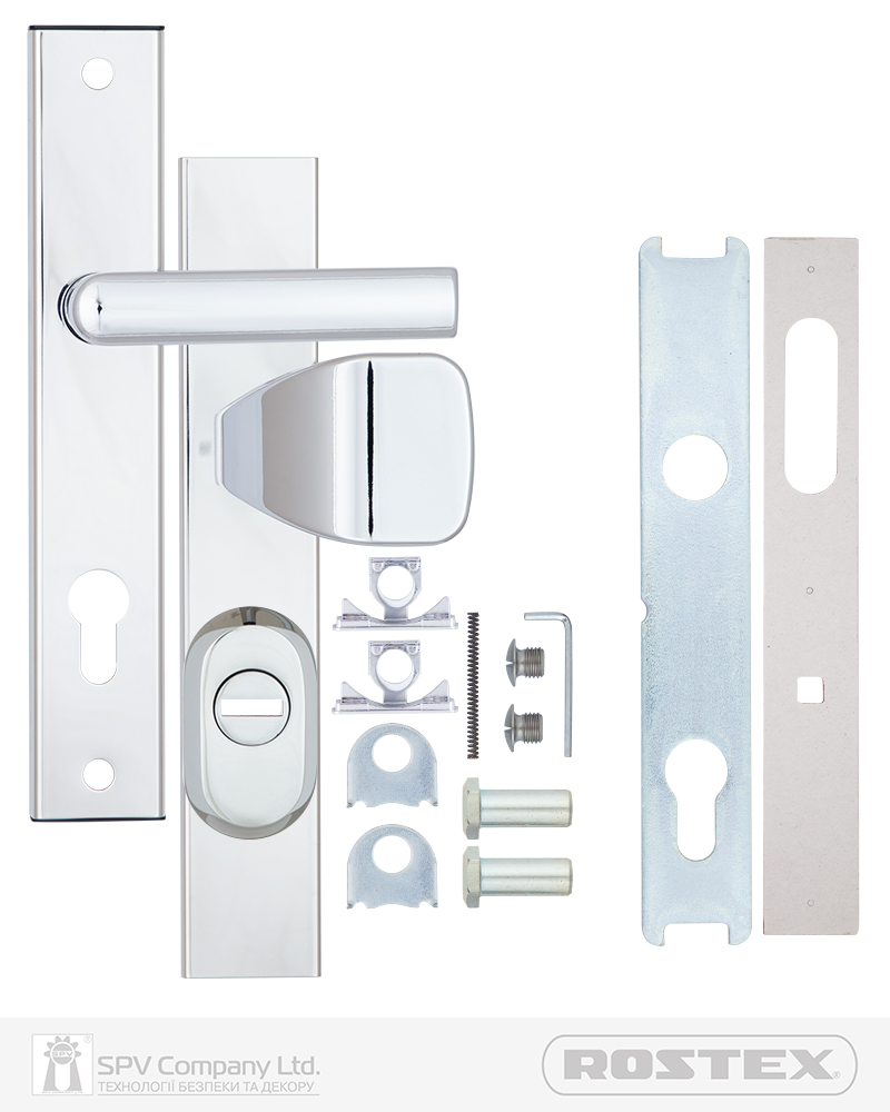 Фурнітура захисна ROSTEX R1 до основних замків для вхідних металевих, деревяних та профільних дверей товщиною 38-55мм з можливістю подовження до 100мм (комплекти подовження замовляються окремо). З-й клас безпеки. Матеріал: нержавіюча сталь, замак. Плата, що захищає корпус замка. Загартований протектор циліндра із захистом від висвердлювання. Кріплення - болти М8.