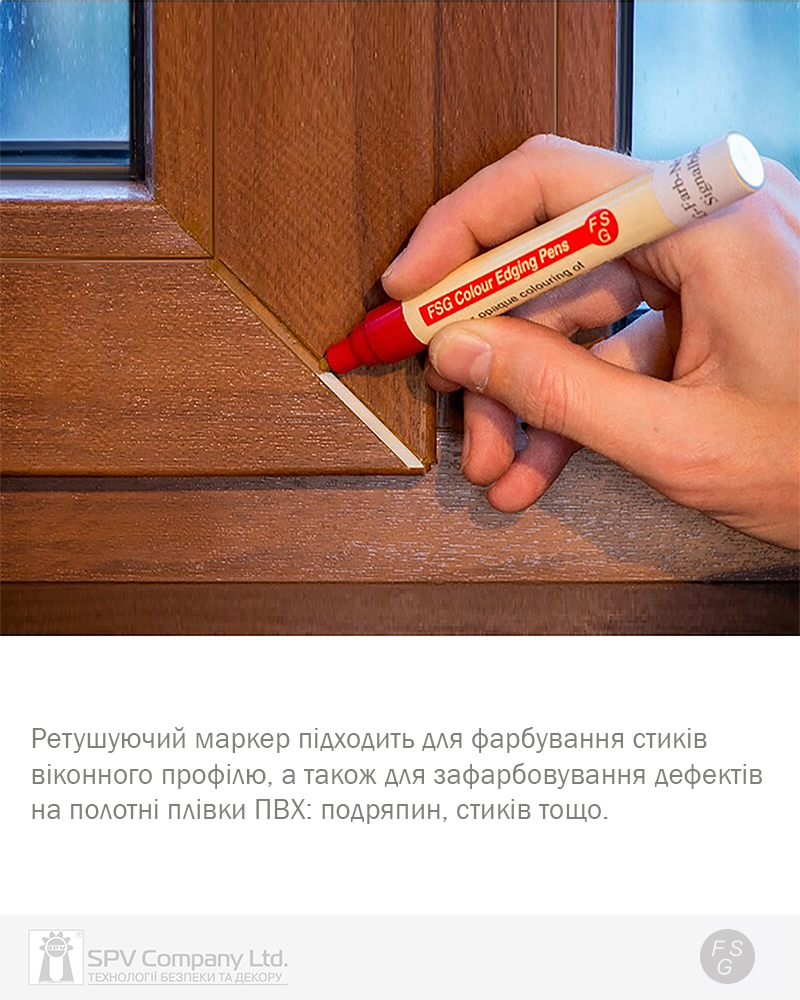 Ретушуючий маркер підходить для фарбування стиків віконного профілю, а також для зафарбовування дефектів на полотні плівки ПВХ: подряпин,стиків тощо.