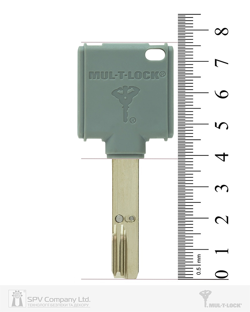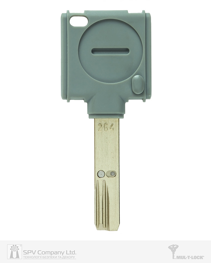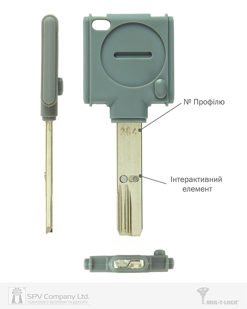 Бланк ключа SYNERKEY (звичайний механічний ключ, у головку якого вбудовано транспондер (міні-картка доступу), на ключовій платформі INTERACTIVE+ класу High Security з інтерактивним елементом та нарізкою для телескопічних пінів до циліндрів INTERACTIVE+. Захищений патентом до 2028р.