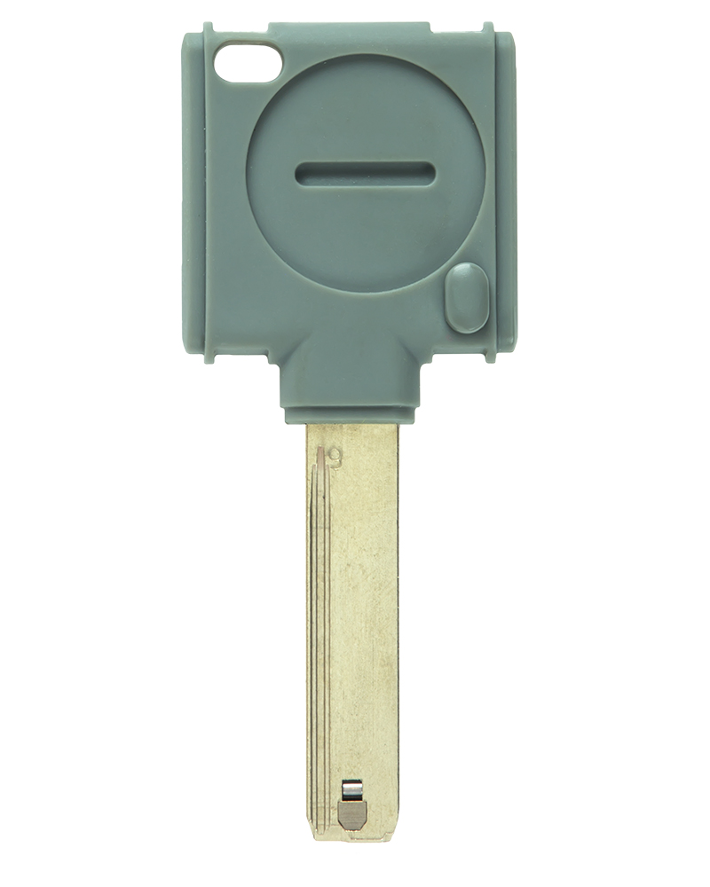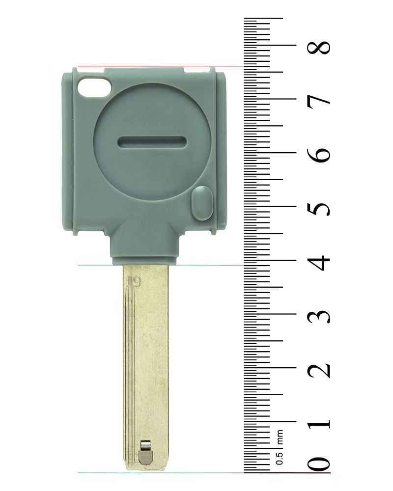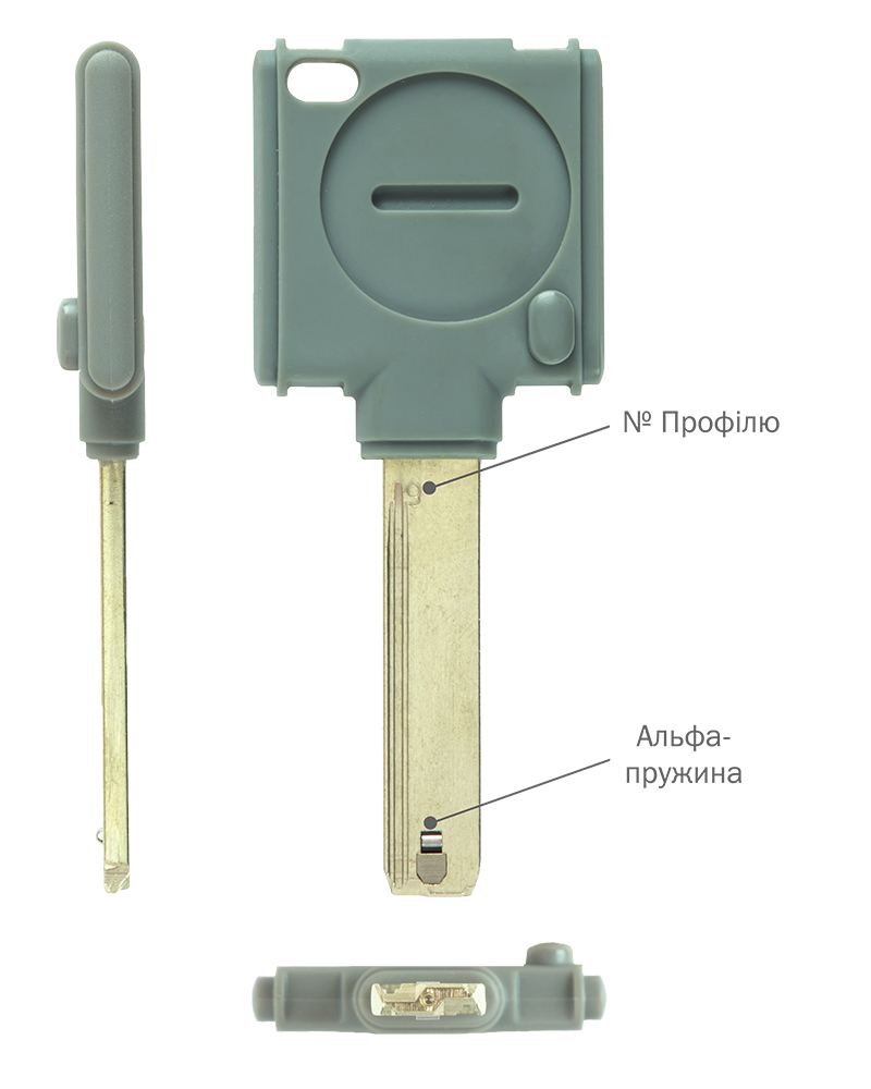 Бланк ключа SYNERKEY (звичайний механічний ключ, у головку якого вбудовано транспондер (міні-картка доступу), на ключовій платформі MT5+ класу Extra Security з інтерактивним елементом "Альфа-пружиною", нарізкою для телескопічних пінів та нарізкою - "змійкою" до циліндрів MT5+. Захищений патентом до 2025р.