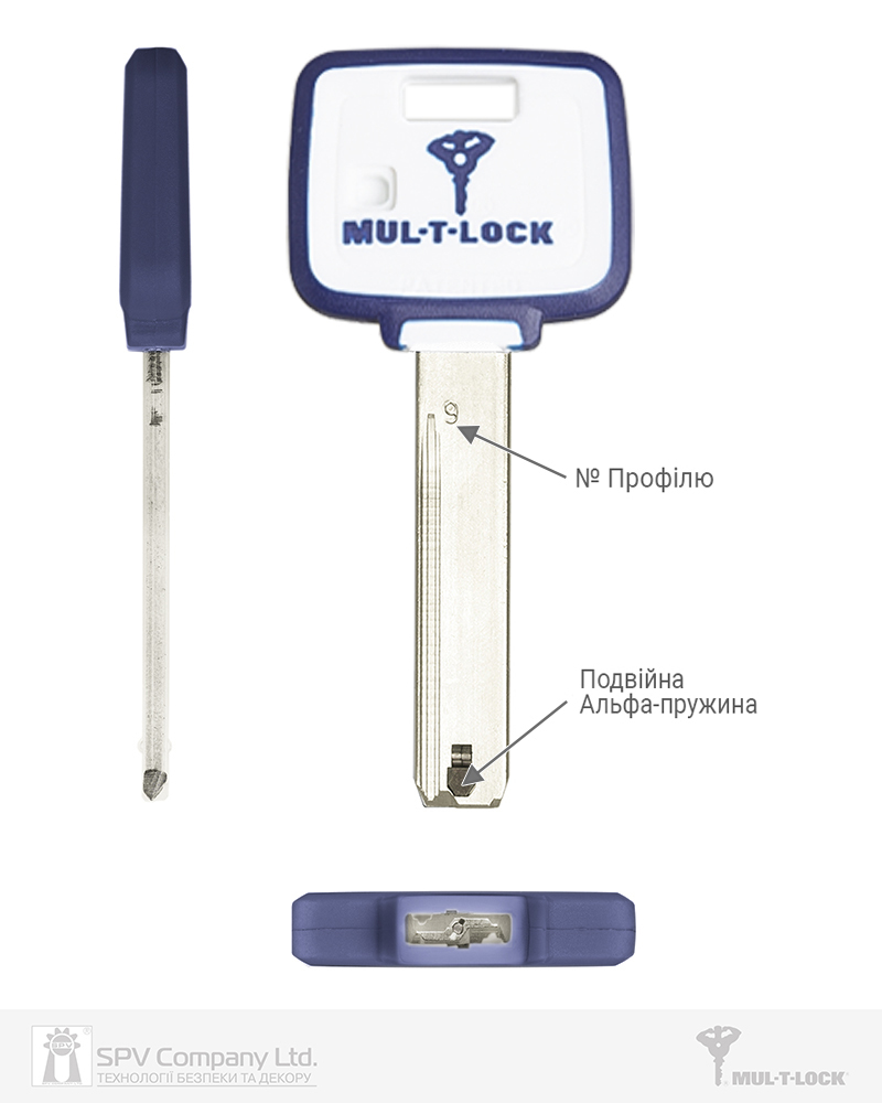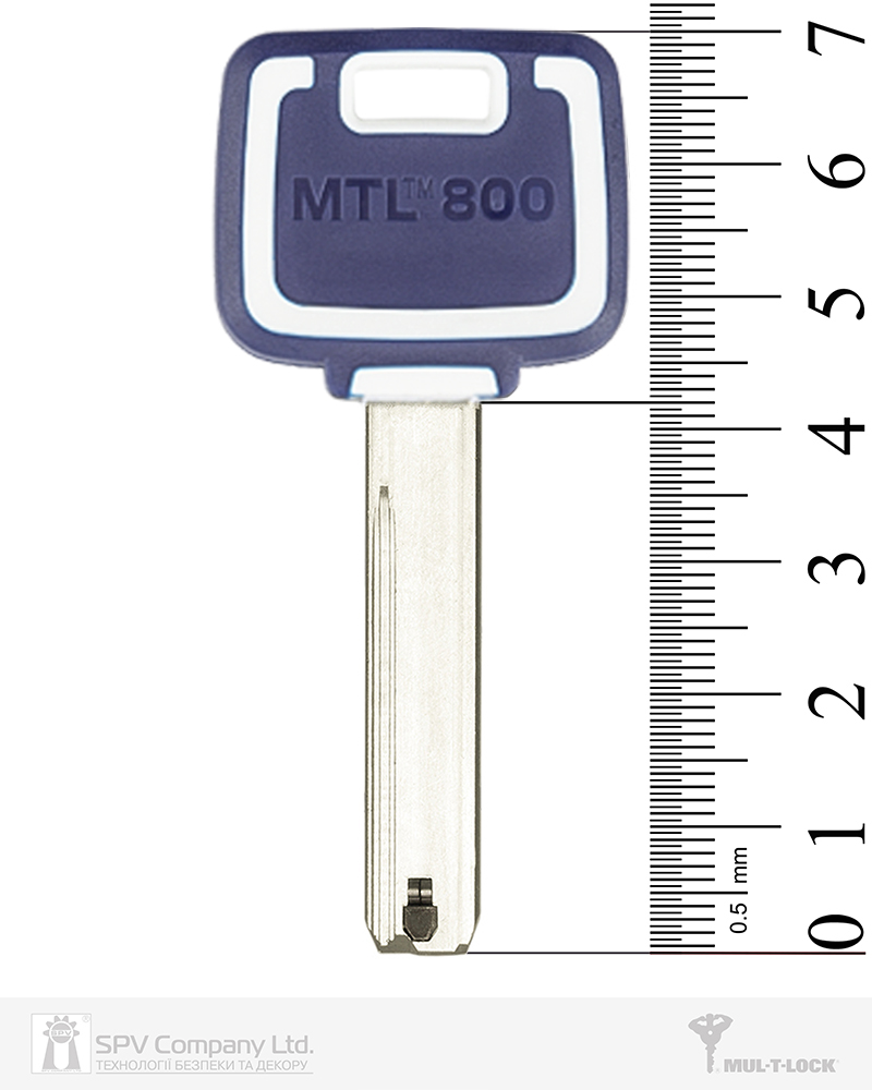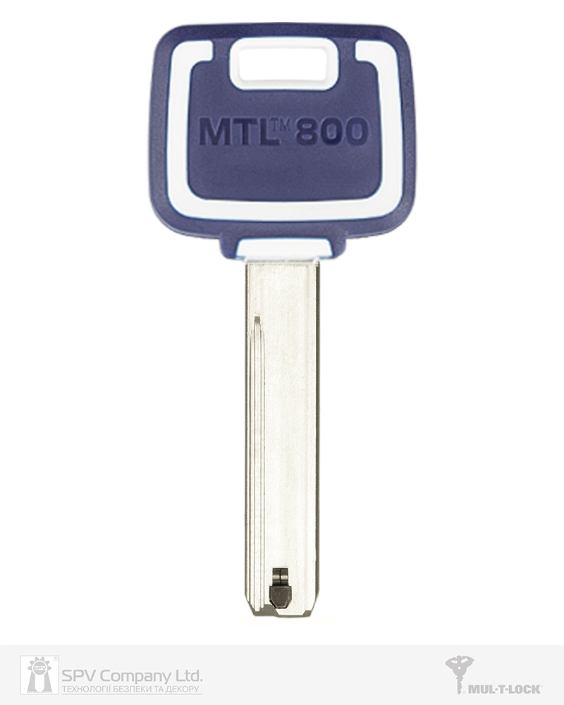 Бланк ключа класу Extra Protected High Security з інтерактивним елементом "подвійною Альфа-пружиною" (double Alfa spring) до циліндрів MUL-T-LOCK серії MTL800 з головою в синьо-білих кольорах