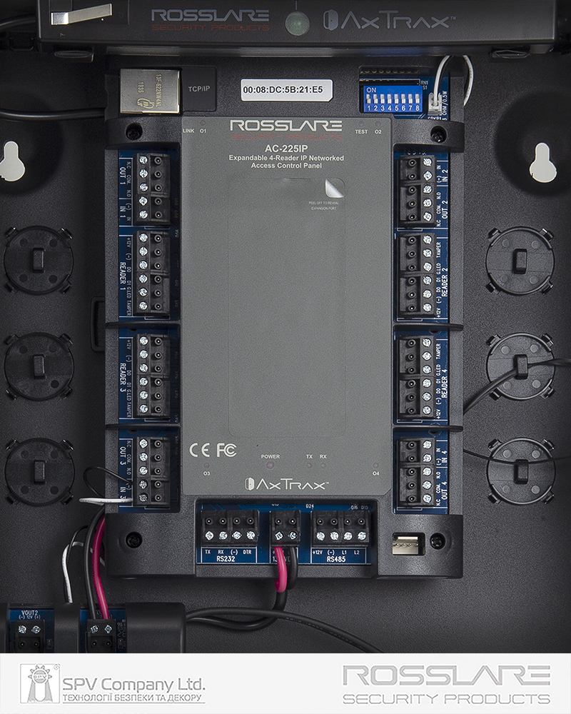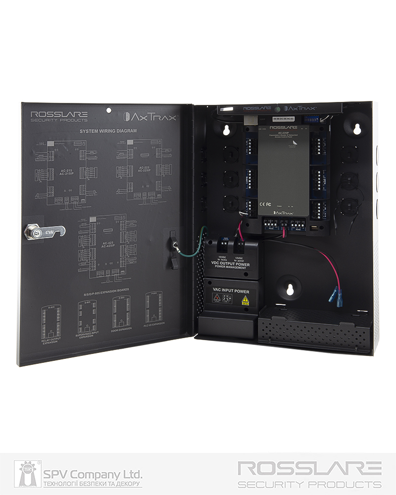 Мережевий електронний контролер ROSSLARE AC-225IP-BE розрахований на підключення 2 (двох) зчитувачів та має можливість керувати або одними дверима на вхід та вихід, або двома дверима тільки вхід.