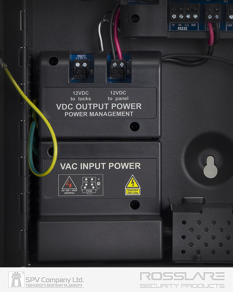 - Інтегрований блок живлення (12 В постійного струму 4А) для власних потреб, а також для зчитувачів (максимальний струм 300 мА для кожного) та електричних замків (максимальний струм 3 А)