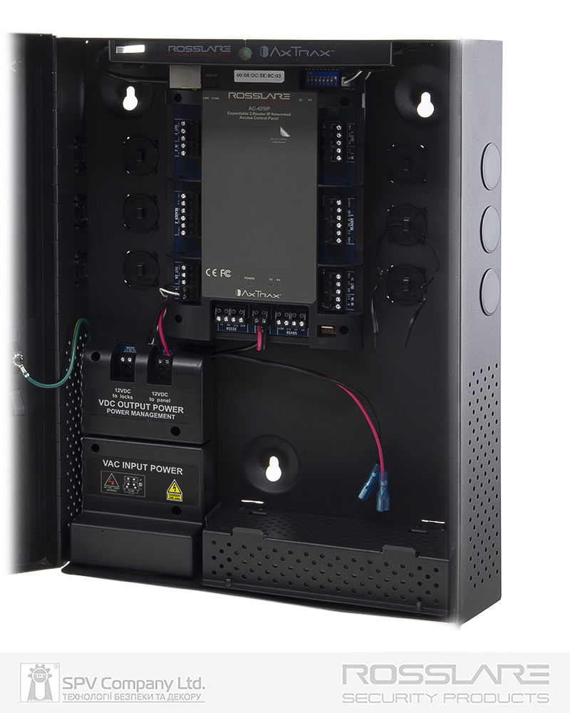 - Інтегрований блок живлення (12 В постійного струму 4А) для власних потреб, а також для зчитувачів (максимальний струм 300 мА для кожного) та електричних замків (максимальний струм 3 А)