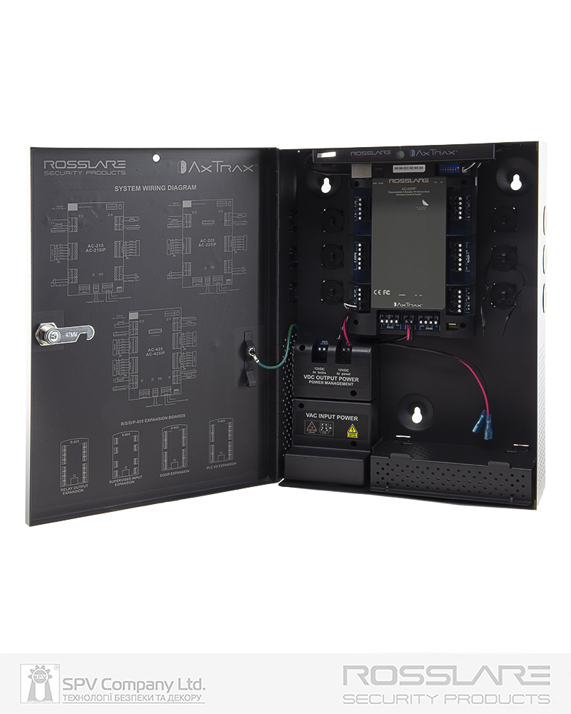 Мережевий електронний контролер ROSSLARE AC-425IP-BE розрахований на підключення 4 (чотирьох) зчитувачів та має можливість керувати або двома дверима на вхід та вихід, або чотирма дверима тільки вхід.