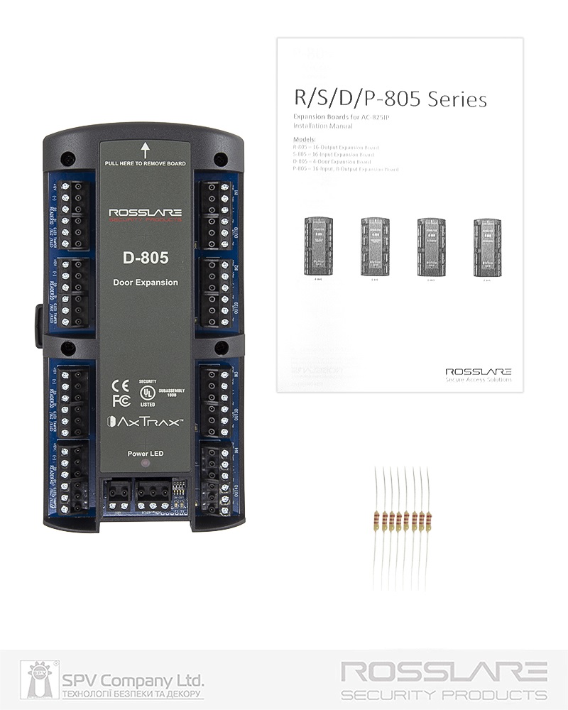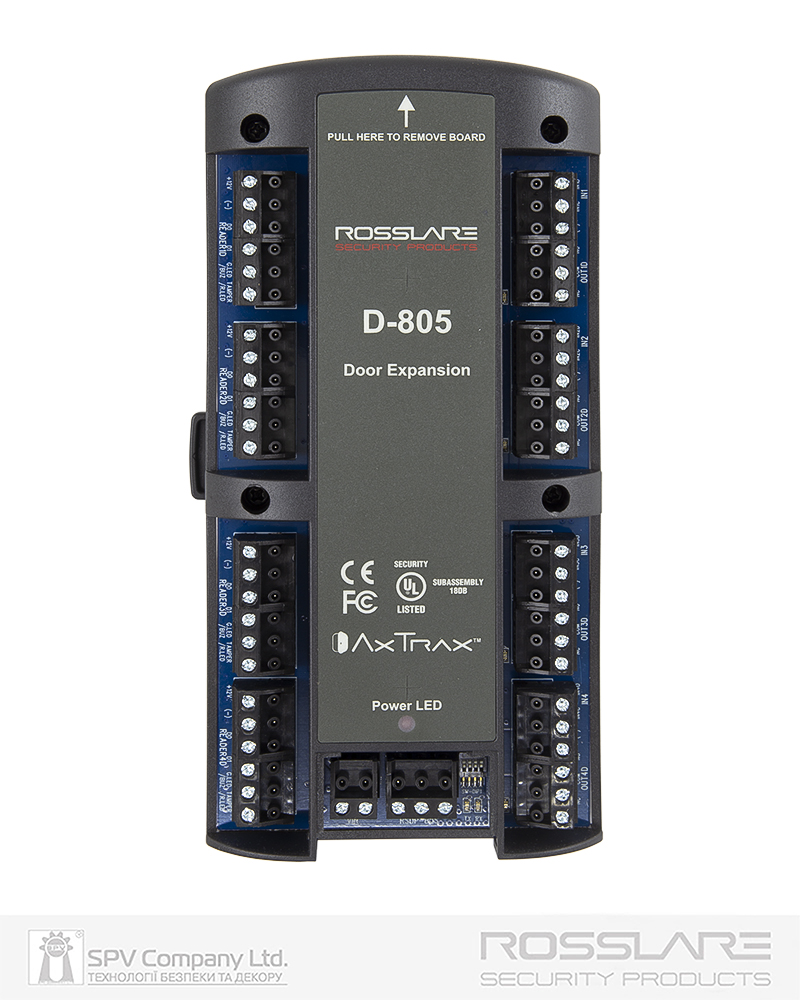 Одна плата розширення D-805 дозволяє підключити до контролеру чотири додаткових зчитувача або кодових панелей и через контролер AC-825IP додатково керувати доступом до чотирьох дверей на вхід або двома дверима на вхід та вихід. Також додатково на платі розміщено 8 електрічних контрольованих входів для отримання вхідних сигналів. Наприклад, кнопки виходу при одностороньому контролі дверей, та/або датчики стану дверей, вікон, руху, освітлення тощо.