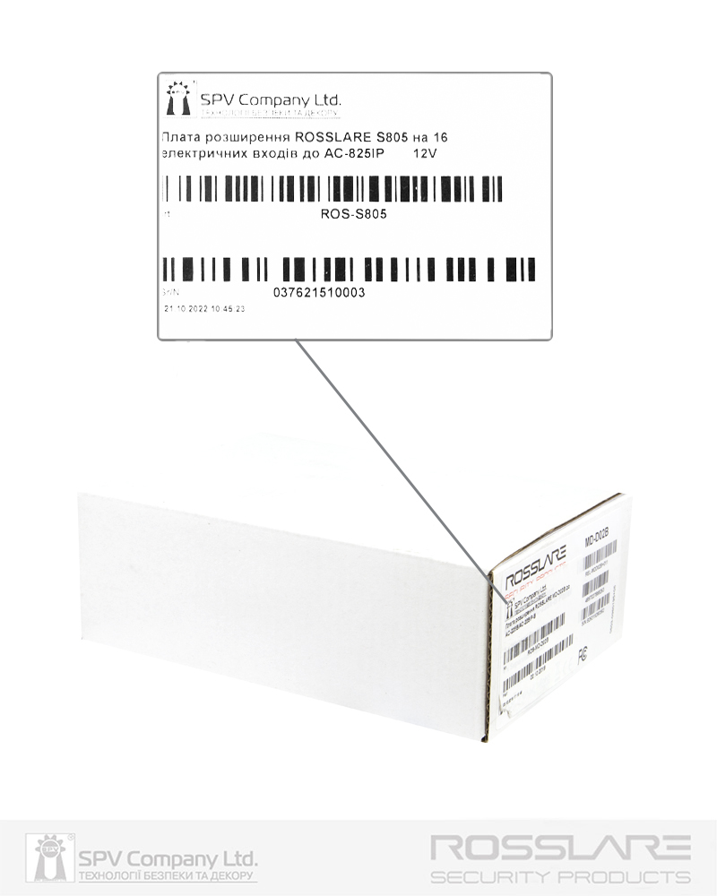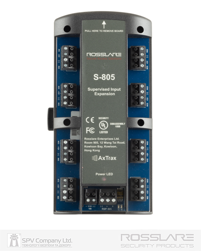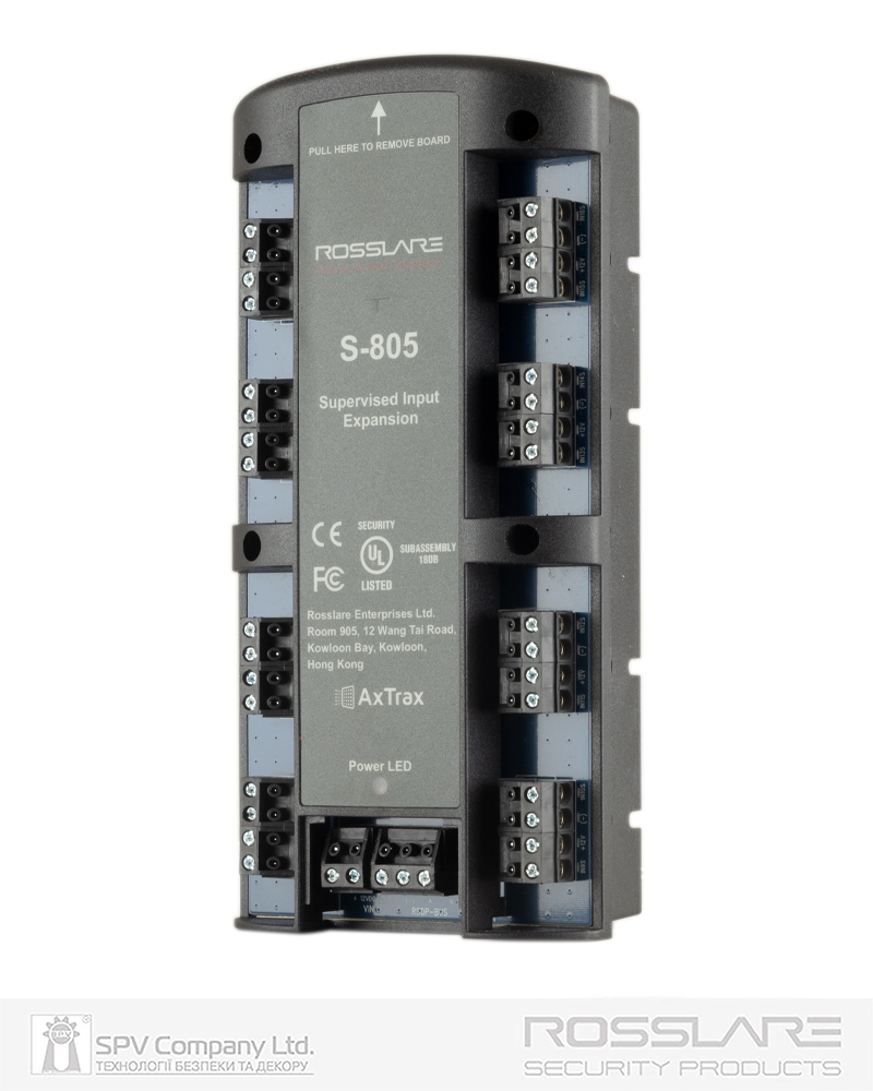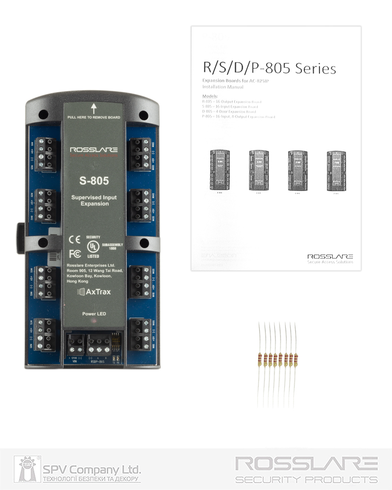 Одна плата розширення S-805 має на борту 16 контрольованих електричних входів та дозволяє підключити до контролеру AC-825IP 16 електрічних механізмів моніторінгу стану об'єкта (наприклад, кнопки виходу, сигнали спрацювання інших приладів або датчики стану дверей/вікон, руху, диму тощо).
