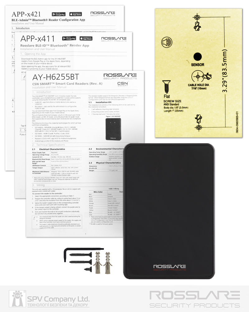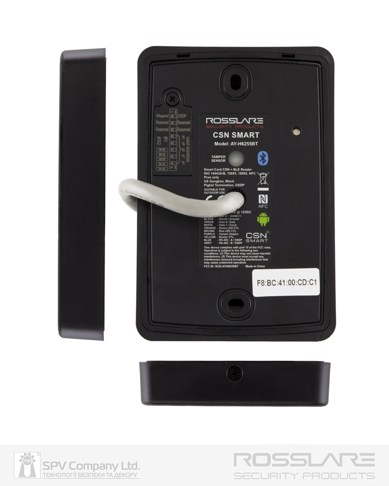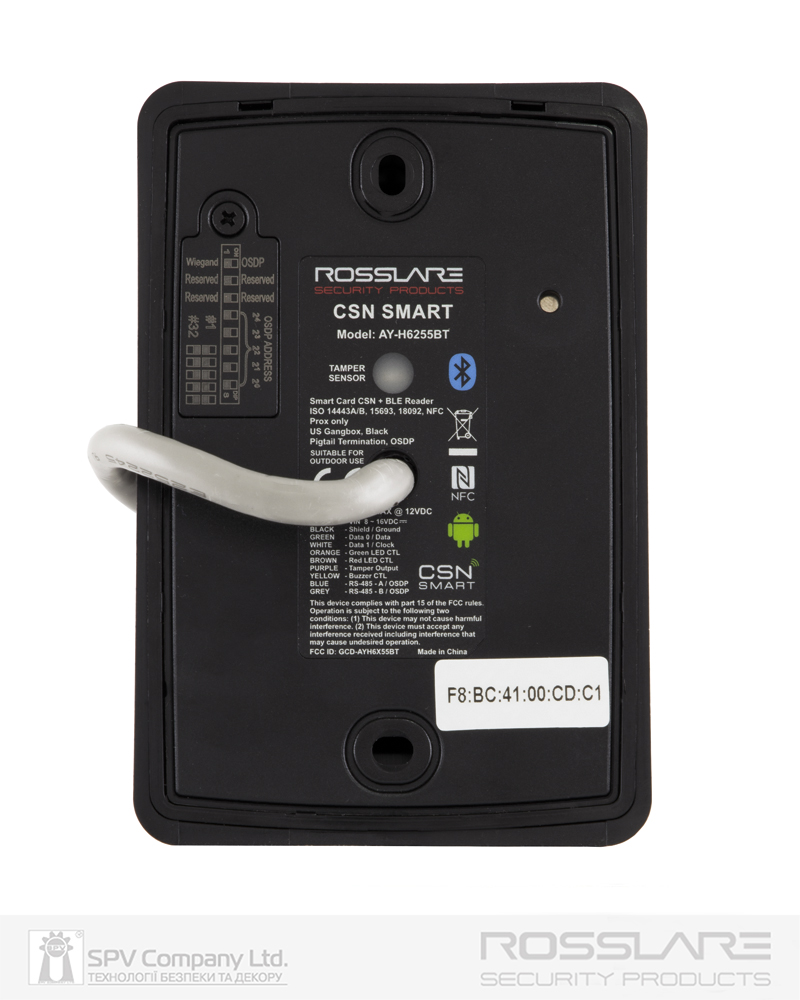 Інноваційний мультиформатний зчитувач безконтактних карт серії Rosslare CSN SMART™ для застосування всередині та ззовні приміщень разом з контролерами ROSSLARE® АС-015, АС-020, мережевими контролерами ROSSLARE® AC-215x-B, AC-225x-B, AC-425x-B, AC-825IP та контролерами інших виробників, які підтримують інтерфейси Wiegand або OSDP.