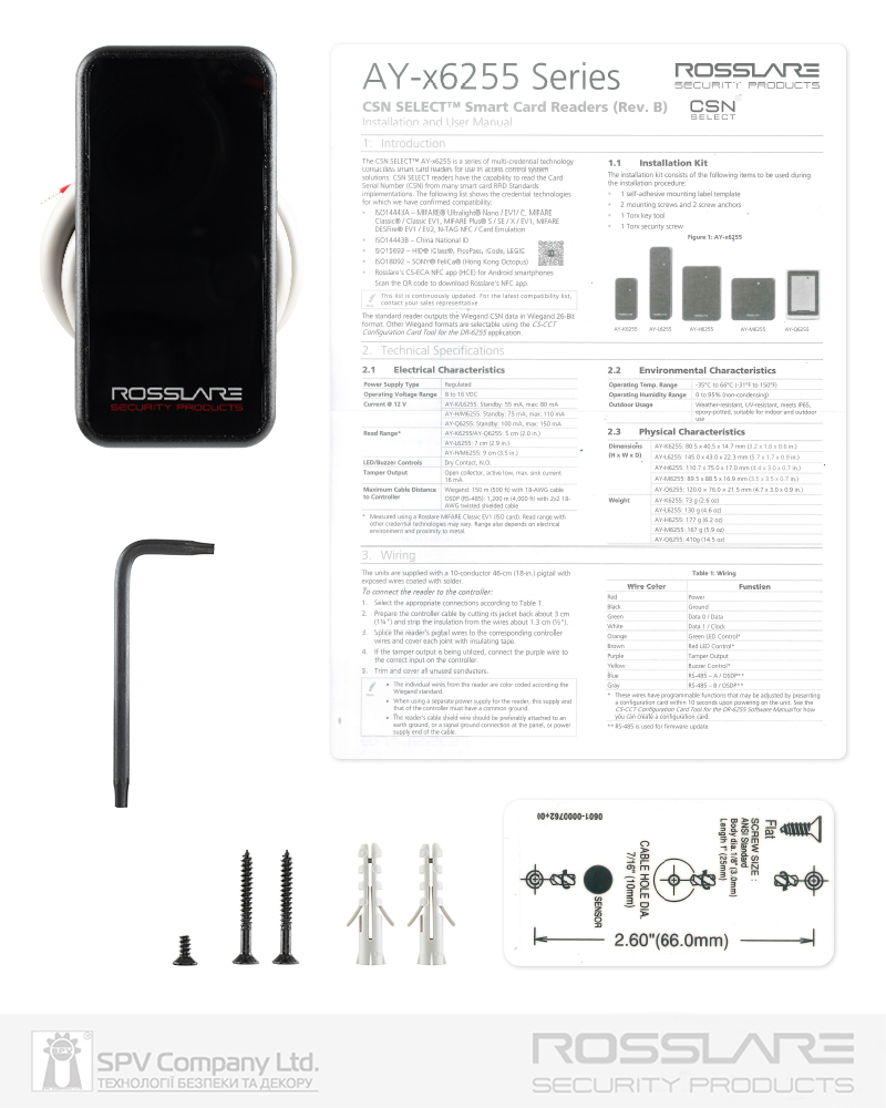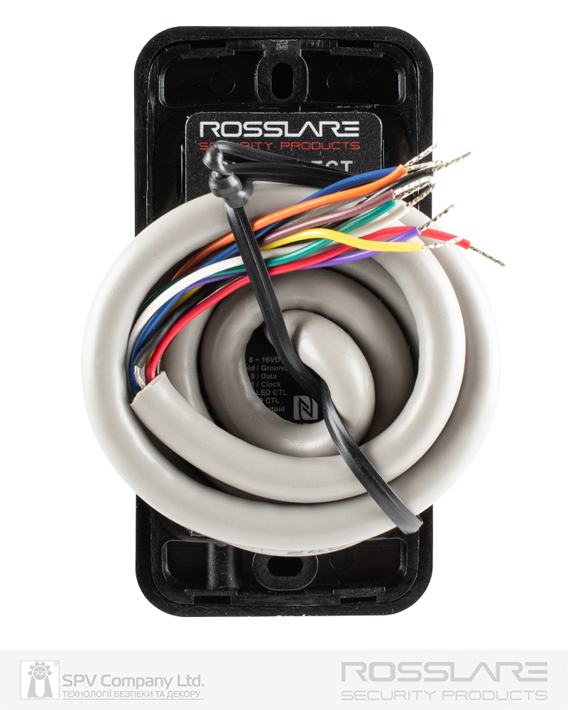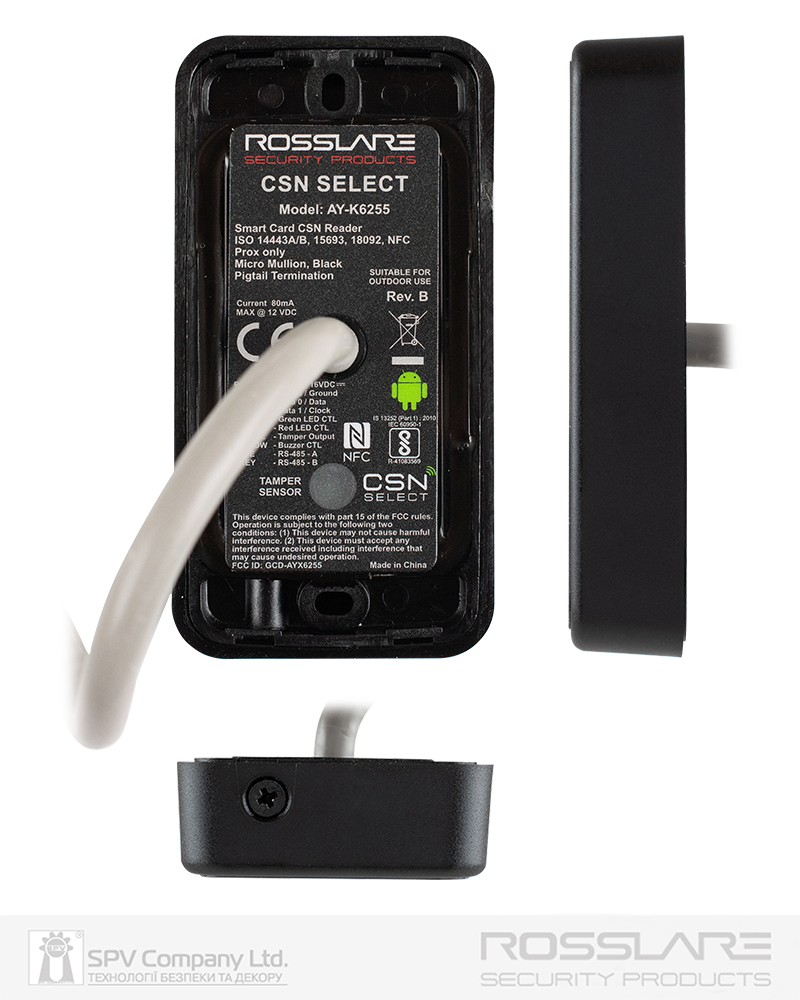Інноваційний мультиформатний зчитувач безконтактних карт серії Rosslare CSN SMART™ для застосування всередині та ззовні приміщень разом з контролерами ROSSLARE® АС-015, АС-020, мережевими контролерами ROSSLARE® AC-215x-B, AC-225x-B, AC-425x-B, AC-825IP та контролерами інших виробників, які підтримують інтерфейси Wiegand.