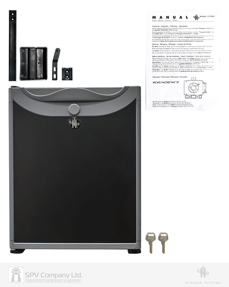- Обладнані механічним замком дверцят, який можливо активувати або деактивувати залежно від потреб готелю.