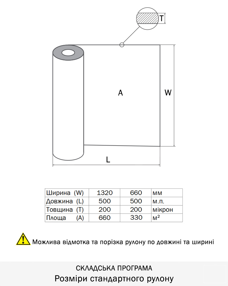 Рулони шириною 1320мм довжиною 400-600м.п, товщина 0,200мм. Можлива порізка по ширині та довжині.