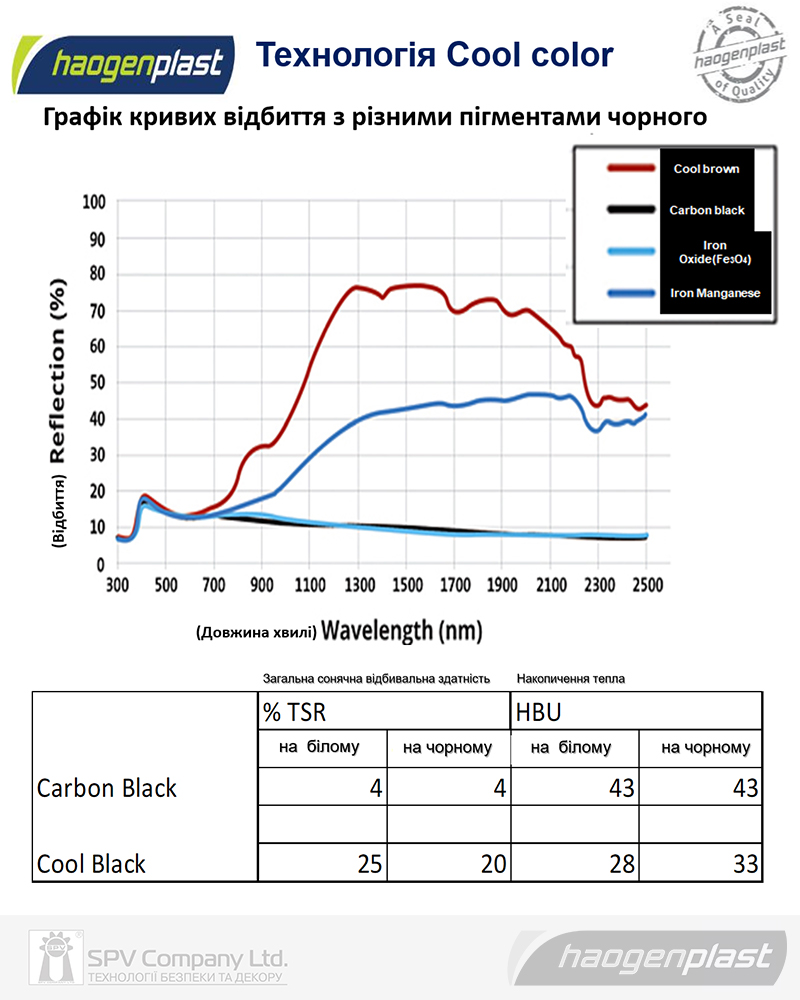 Cool Black – новий колір, глибокий чорний завдяки новим пігментам COOL COLOR, які не нагріваються, а пропускають сонячну енергію крізь себе. Дана плівка призначена для ламінаціїї темного профілю і має додаткову білу основу від якої відбивається сонячне тепло.