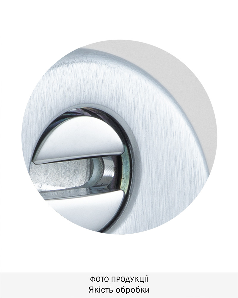 Обробка хром матовий. Має матову поверхню, що царапана щіткою, сріблясто-сірого кольору. Найкраще виглядає на дверях червонуватих відтінків – від світлого кремового до темнокоричневого шоколадного. Для інтер’єрів у сучасних та класичних стилях.