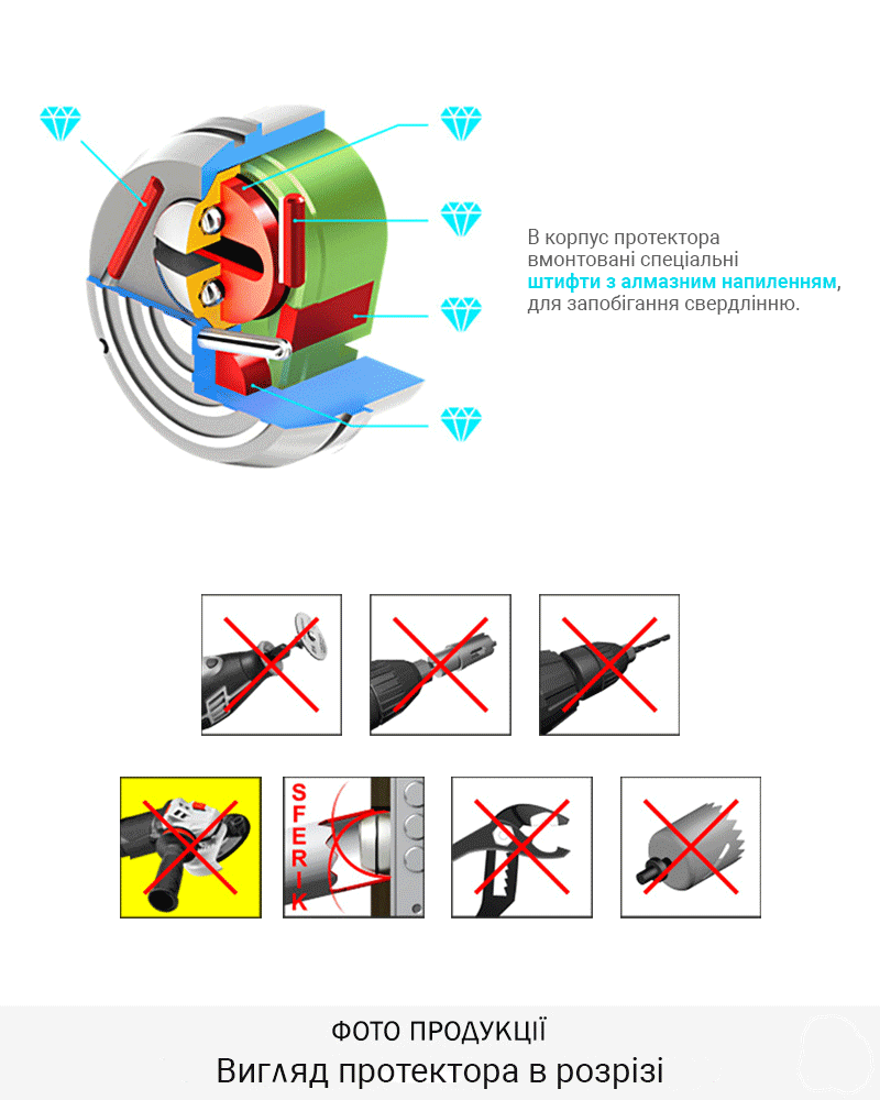 -В корпус протектора вмонтовані спеціальні штифти з алмазним напиленням, для запобігання свердлінню.